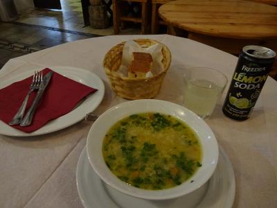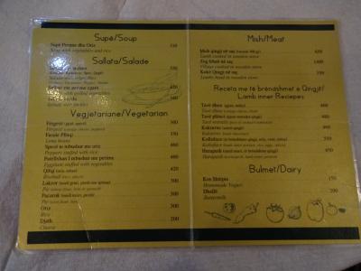 カードは使えず、レクは500Lek程しか持っていなかったのでスープとジュースを注文。メニューは見開きの両面で全てと多くなく、スープは1種類しかありません。野菜とご飯が入ったコンソメスープのような感じで、とても美味しかったです。甘くないカステラのようなパンも付きます。