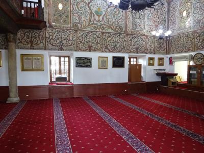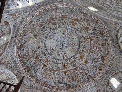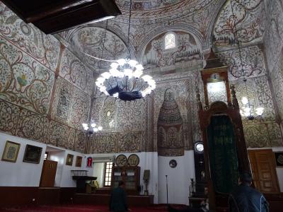 建物に入るとまず下駄箱があり、靴を脱いで中に入ります。それほど大きなモスクではありませんが、2つの部屋と外壁の一部はびっしりとフレスコ画に覆われた見事なものでした。玄関の部屋のフレスコ画には、建築された19世紀当時のティラナの町が描かれています。