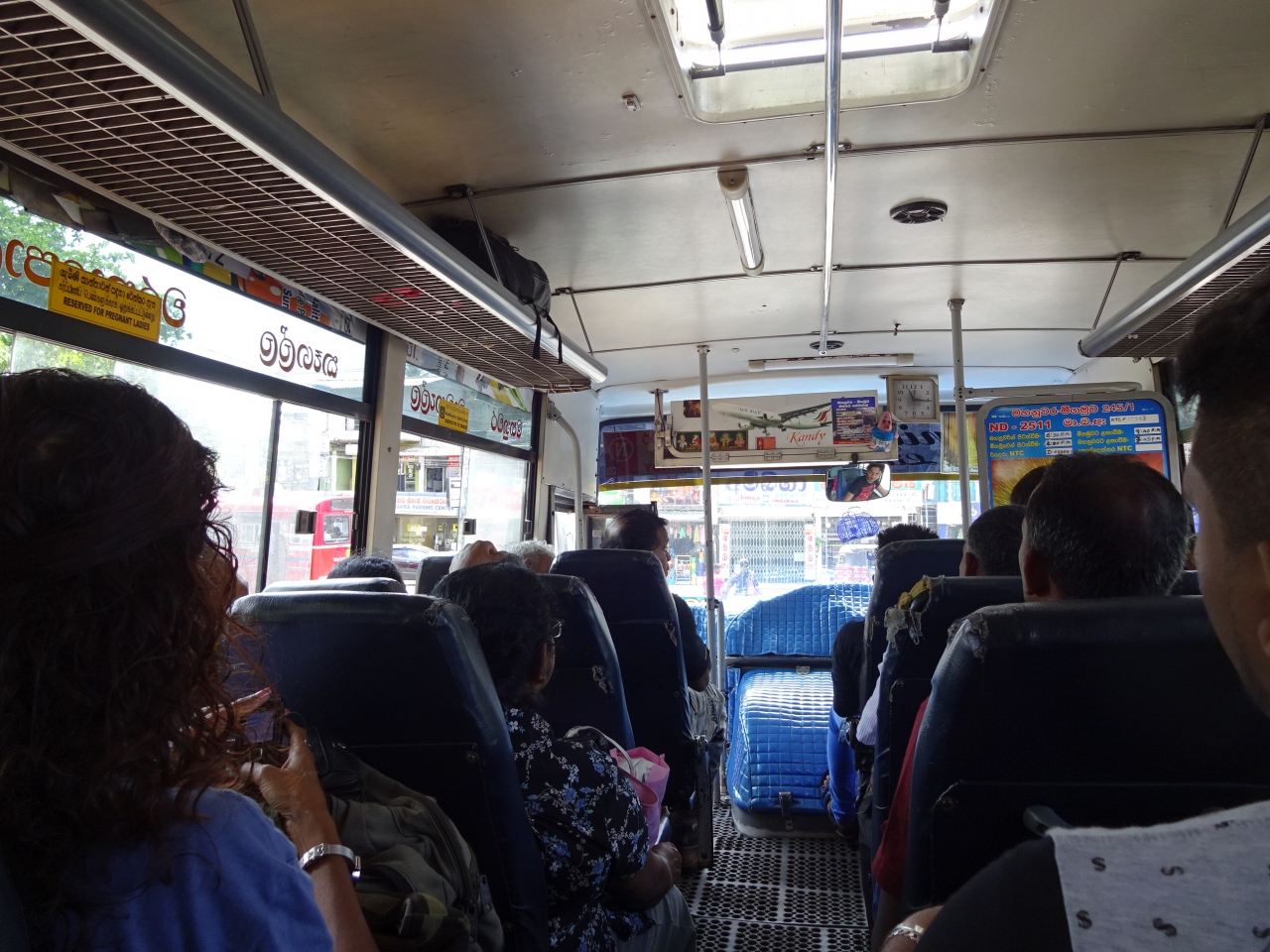 通常、バスの座席といえば2-2の配置ですが、スリランカのバスはほぼ全て2-3です。なので狭い!横幅も狭いし、シートピッチも狭い。隣の人とギュウギュウ密着します。2-2のバスでも同じくらい狭いです。