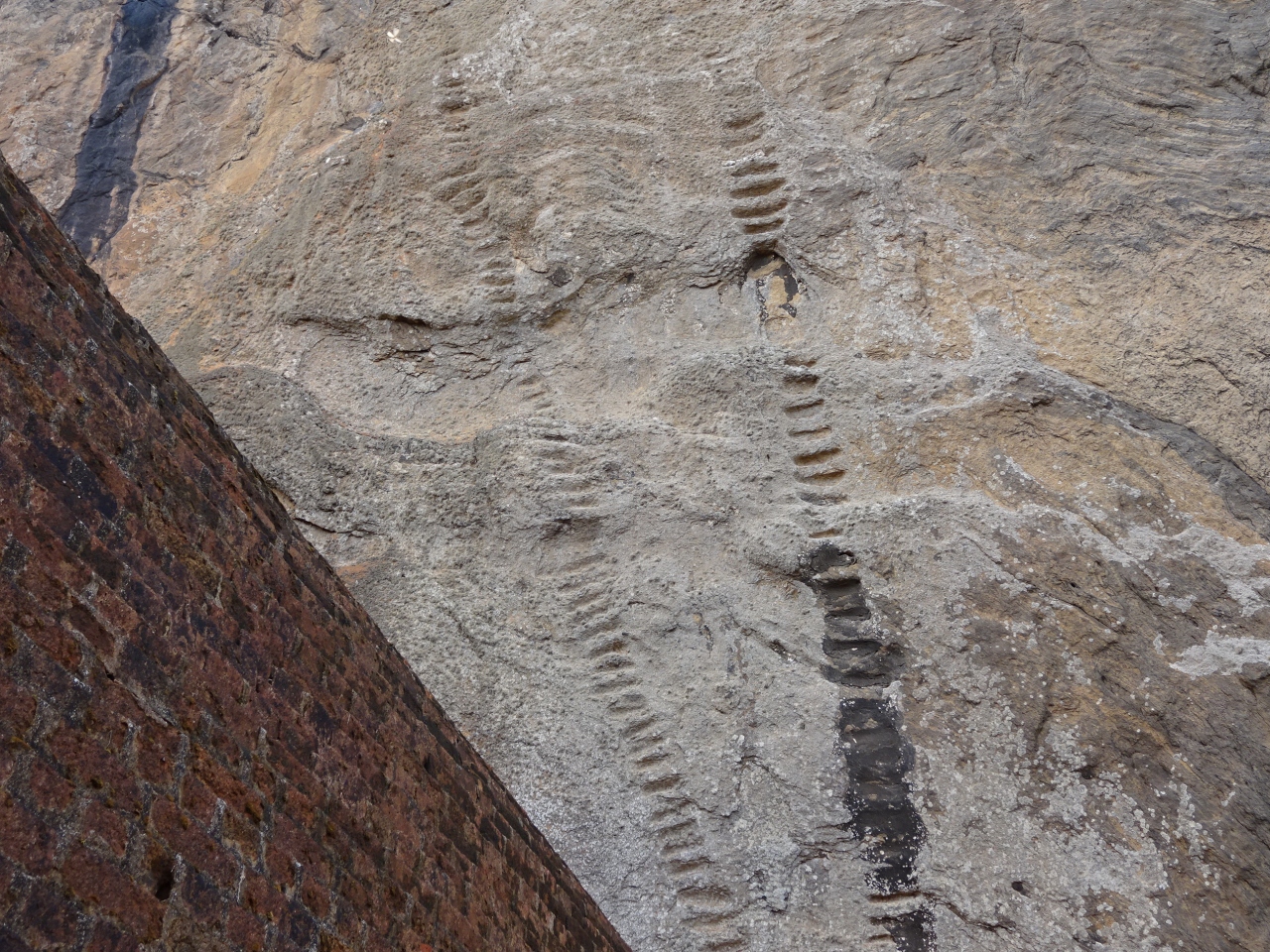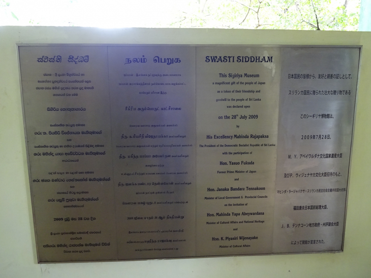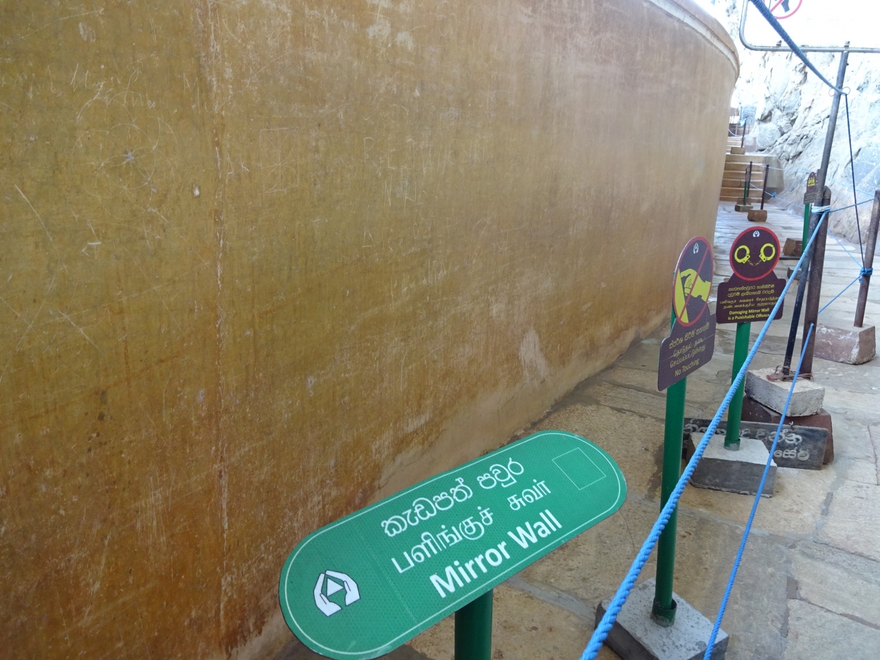 ミラーウォールの表面には叙事詩や、シーギリヤレディについての詩が彫られています。詩は7~11世紀に彫られたもので、685点もあるとのこと。昔のシンハラ文字で書かれているので、現代のスリランカ人には読めないそう。文字はかなり薄く、浅く彫られていたのでよく解読出来たなあと感心しました。ミラーウォールの表面には昔の観光客が残したらしい落書きもあるので、ますます見え辛い。