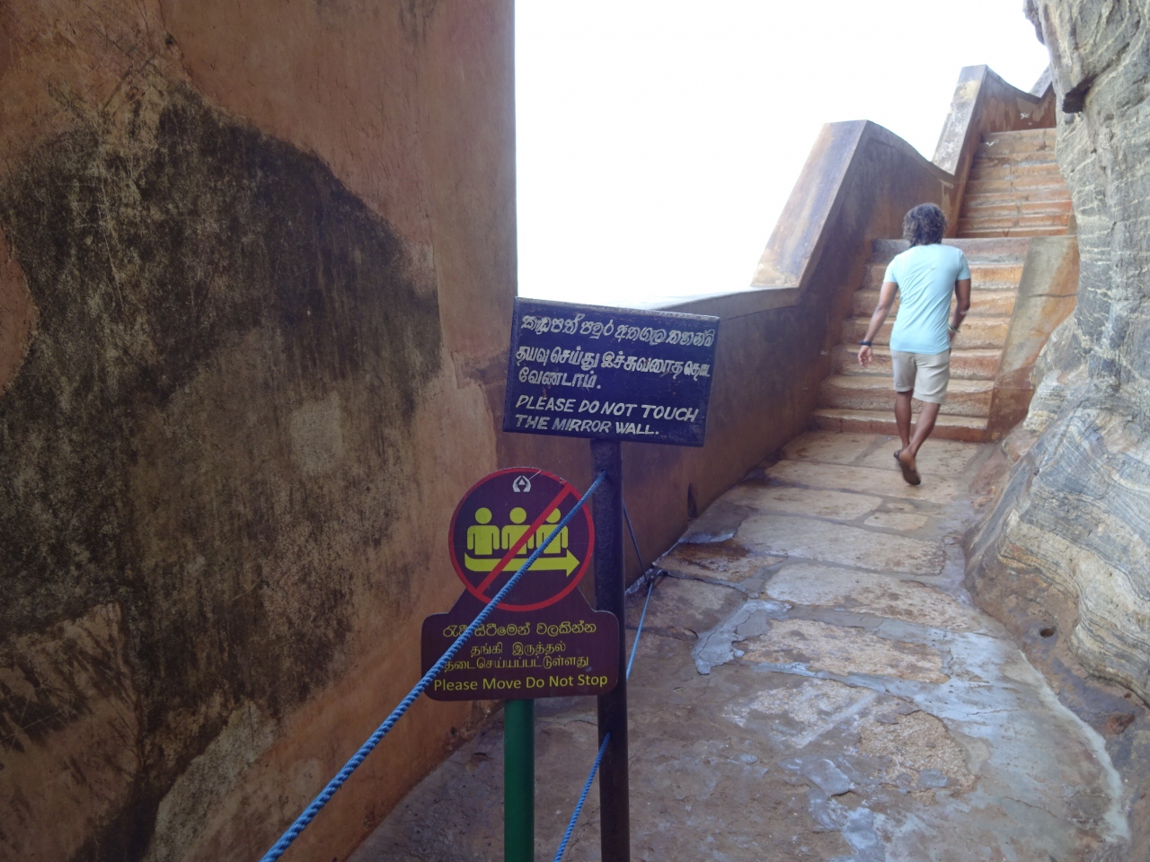 シーギリヤロックの順路に従って進むと、シーギリヤレディの次に通りかかるのがこのミラーウォールです。レンガに漆喰を塗り、その上に卵の白身と蜂蜜と石灰を混ぜたものを塗って磨き上げることで、鏡のように反射する壁が造られました。昔は向かいの壁にもシーギリヤレディが描かれていたらしい。