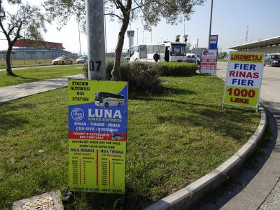 2017年4月現在、ベラット行きのバスが出ているのはスカンデルベグ広場から北西約2.5kmに位置しているSouth bound Bus Station(Terminali i autobuzave te jugut)。双頭の鷲のモニュメントがあるラウンドアバウトの前です。