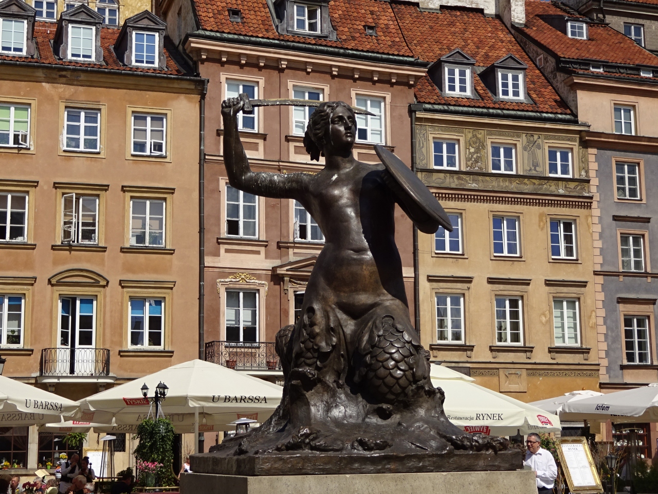 昔々、バルト海からヴィスワ川を遡ってこの辺りに棲みついた人魚が、漁師の網を破って魚を逃がしては人間をからかっていました。怒った漁師達が人魚をとっちめようとしても、つい許してしまうくらい美しい歌声を持っていたそうです。彼女の歌声を利用して一儲けしてやろうと企んだ商人が人魚を捕まえましたが、悲嘆にくれる美しい歌声を聴いた若い漁師が人魚を助け出して川に逃がしました。
