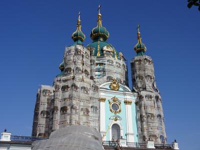 鐘楼とソフィア大聖堂は全くデザインが異なります。大聖堂の外観は17世紀後半にウクライナ・バロック様式で再建されたものだそう。鐘楼は外から見ると、結構傾いているように見えました。
