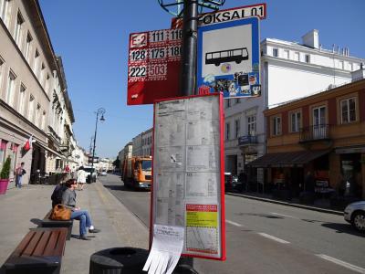 ワルシャワ・ショパン国際空港行きの175番バスは、この通り沿いを走っています。中央駅から乗ると混むので、この辺りから乗るのがお勧め。