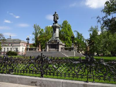クラクフ郊外通り沿いの公園にある像です。アダム・ミツキェヴィチはロマン派の詩人で、ポーランドの象徴的存在。ポーランド独立のために政治活動をした愛国者としても有名で、パリに滞在している時にショパンとも交流があったそう。ショパンはパリに来て間もない頃にミツキェヴィチの詩に旋律を付けたことがあり、後に病気になったミツキェヴィチを訪ねてピアノを演奏し、彼の心を癒したそうです。