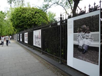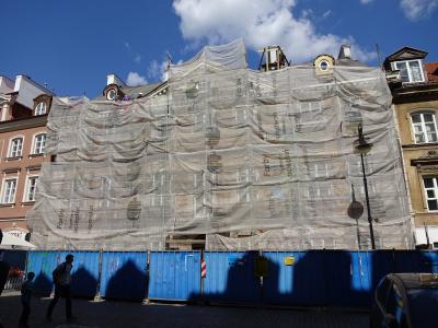 キュリー夫人博物館は、この通り全面修復中でした。前の歩道も封鎖されていてかなり大規模な工事。外観が覆われているので最初は見つけられませんでした。よーく見るとシートの向こうに、外壁の不思議な絵が透けています。