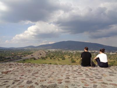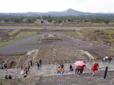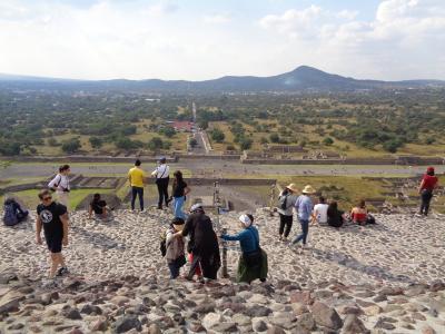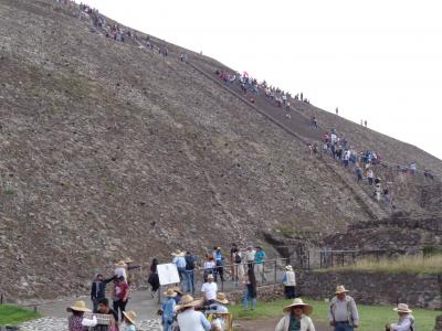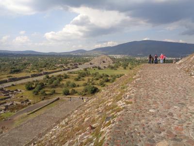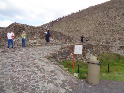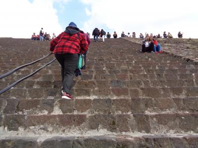 テオティワカンの標高は2,300mもあるので登る前から疲れます。階段は結構急で、ゴムチューブのような手すりが設置されていますが、みんなの手汗でヌルっとしているので殆ど触りませんでした、無くても登れるし下りられます。全景を見て分かる通り、階段がずっと続いているのではなく、中腹的な部分が数か所あるので、座って休みながら登りました。休みながらで15分程で頂上へ。頂上にはさらに小山がありますが、足元が悪くて危ないし、登らない方が景色がいいです。