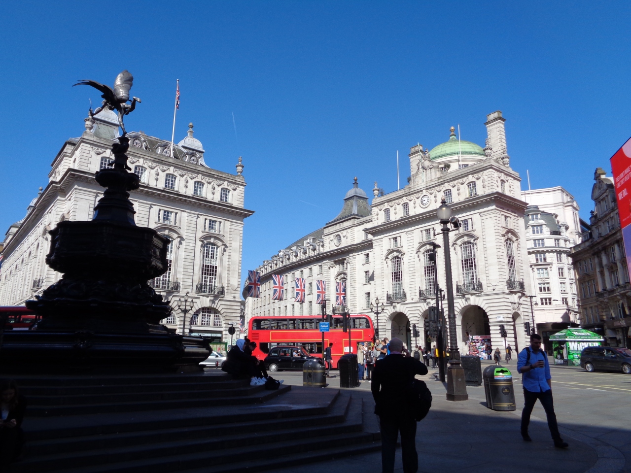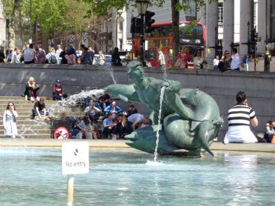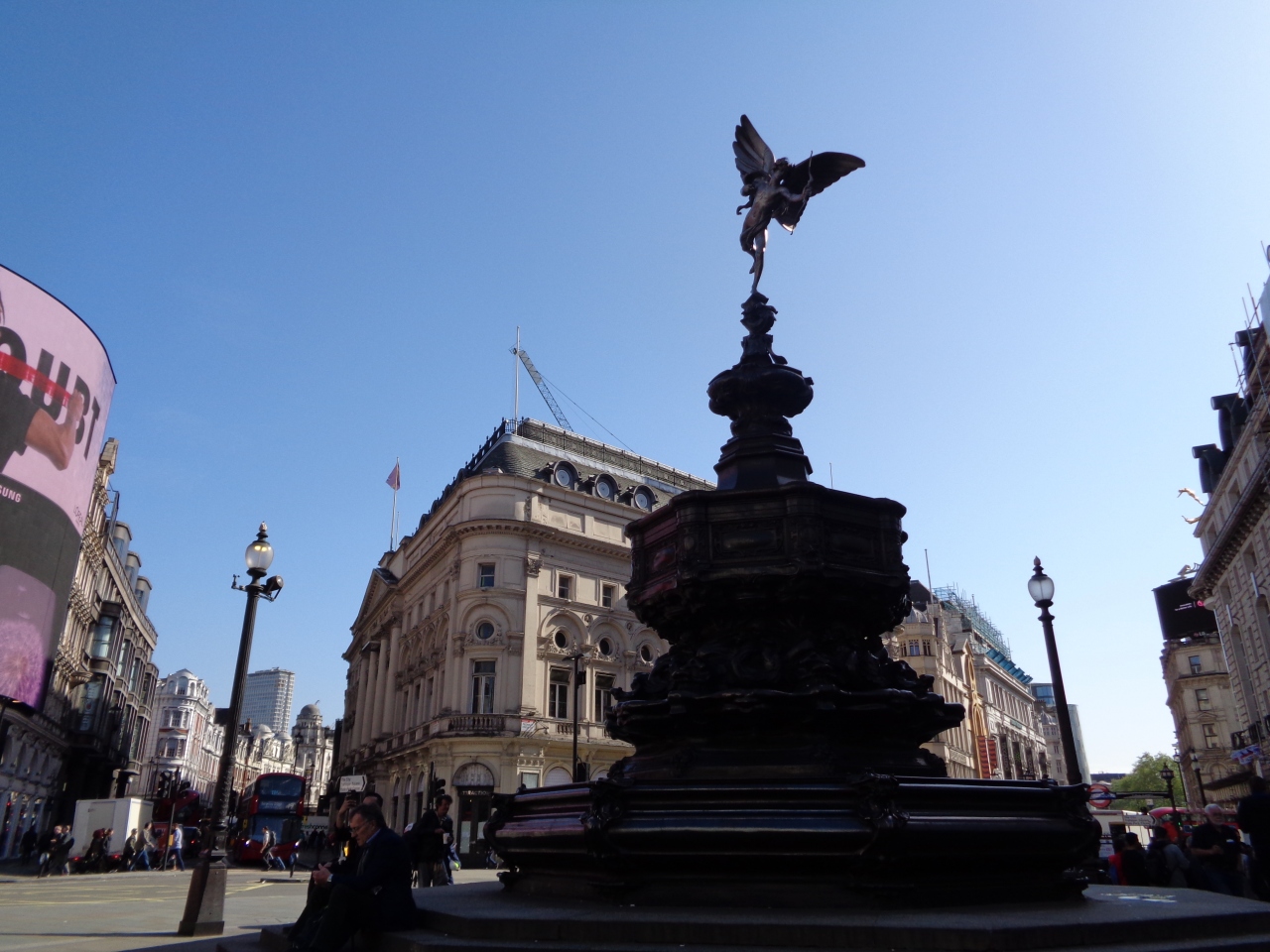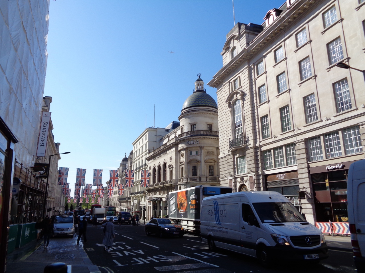 ピカデリーサーカスはロンドン繁華街のど真ん中で、周辺の道は凄い交通量でした。広場を中心に四方八方に道が延びているので、目的の方向への道を見つけるのにてこずり、何度も道を間違えてはここに戻って来ました。あちこちに土産物屋があり、エロスの像について説明を受ける団体旅行者の姿もありました。- 旅行時期