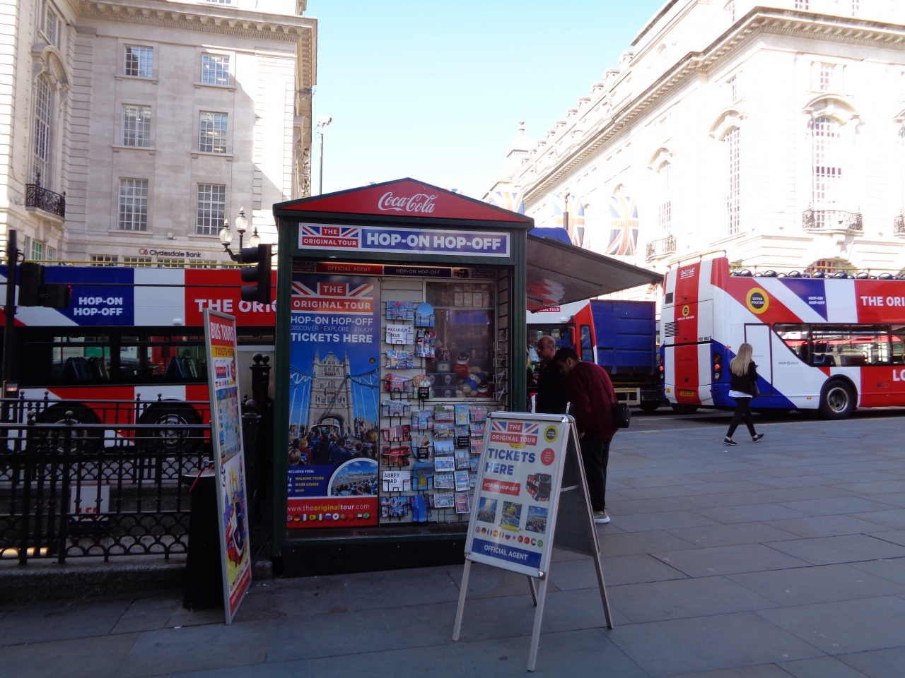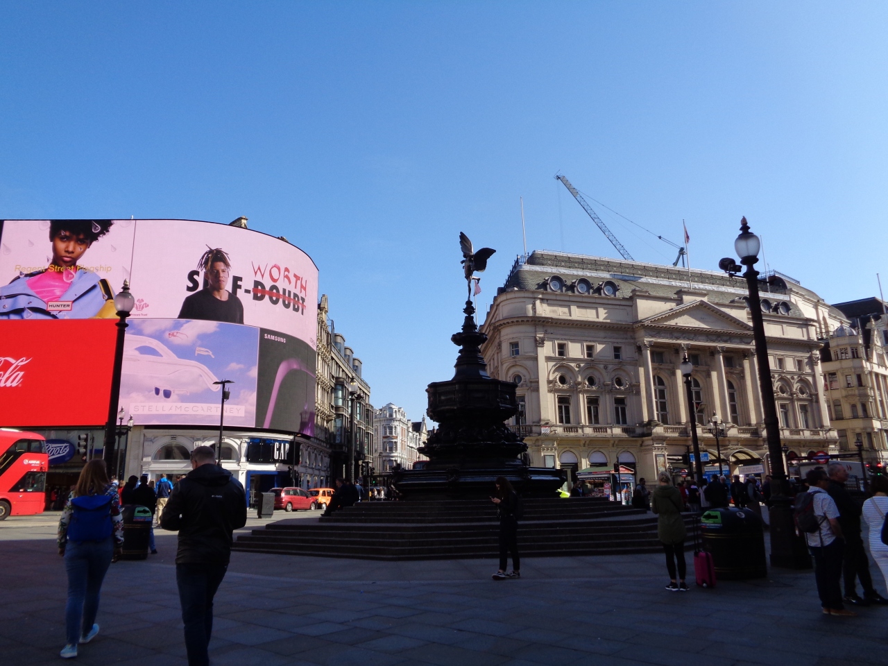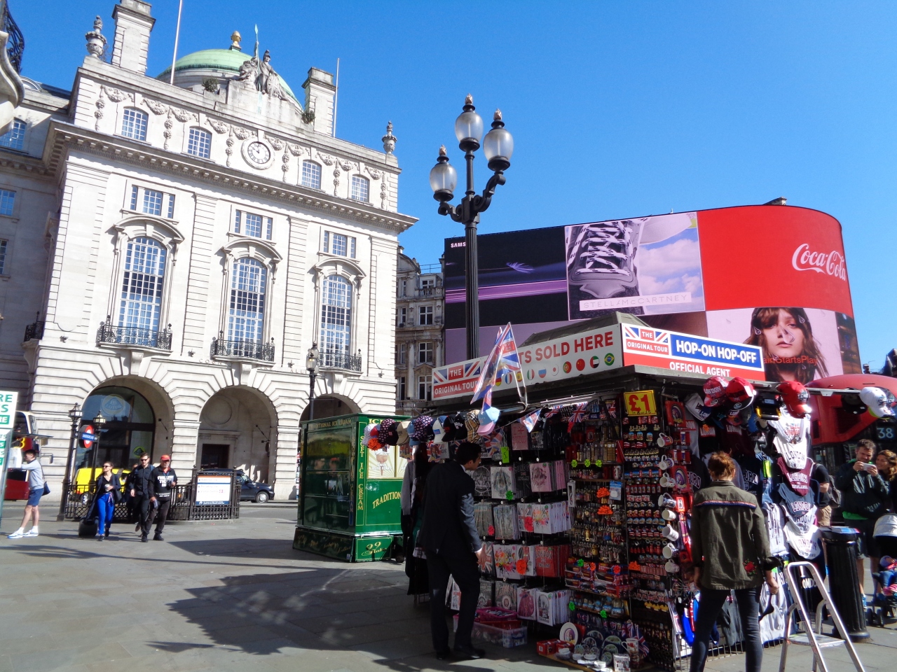 ピカデリーサーカスはロンドン繁華街のど真ん中で、周辺の道は凄い交通量でした。広場を中心に四方八方に道が延びているので、目的の方向への道を見つけるのにてこずり、何度も道を間違えてはここに戻って来ました。あちこちに土産物屋があり、エロスの像について説明を受ける団体旅行者の姿もありました。- 旅行時期