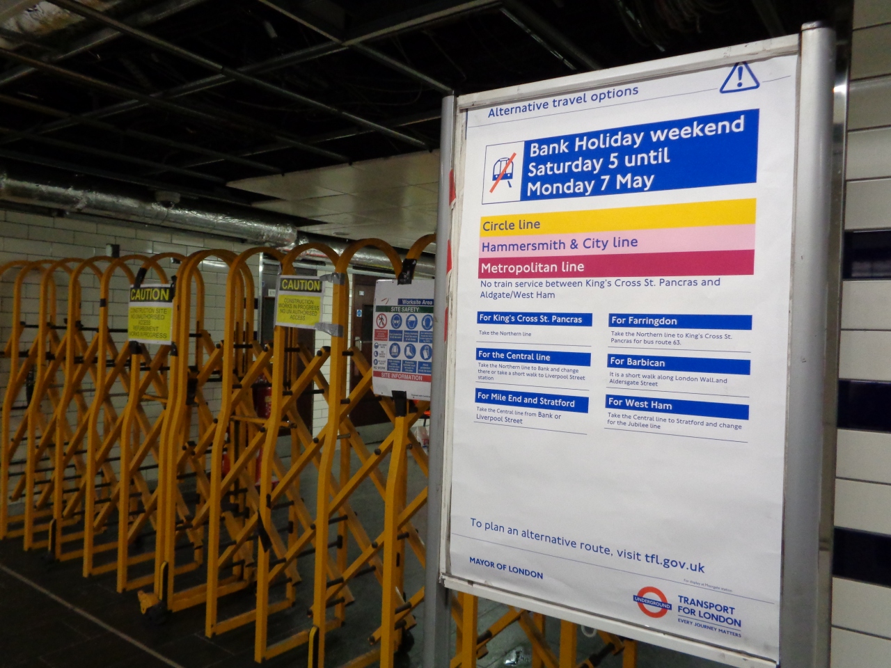 私はちゃんと読まずに独断で動いたせいで、物凄く時間を浪費する羽目になりました。ロンドンはいろんな路線が入り組んでいるので、一部が運休しても目的地には辿り着けます。こういうポスターがあったらスルーせず読んで下さい。- 旅行時期