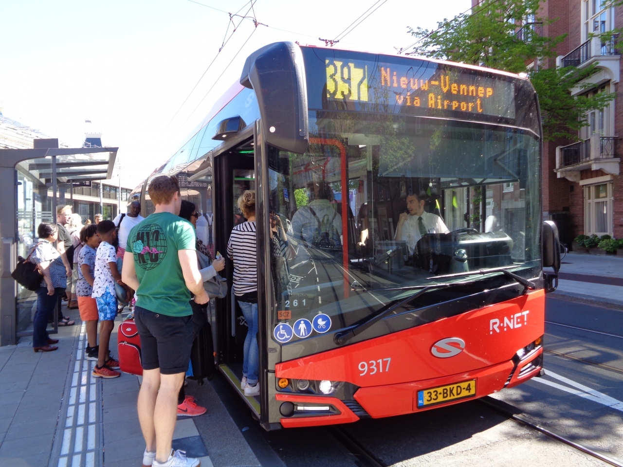 アムステルダム市内からスキポール空港へのバスは、397番。最新(2017~18)の地球の歩き方には197番と書かれていますが、バス番号が変わっているので注意。グーグルマップで最新のバス番号と時刻表が確認できます。