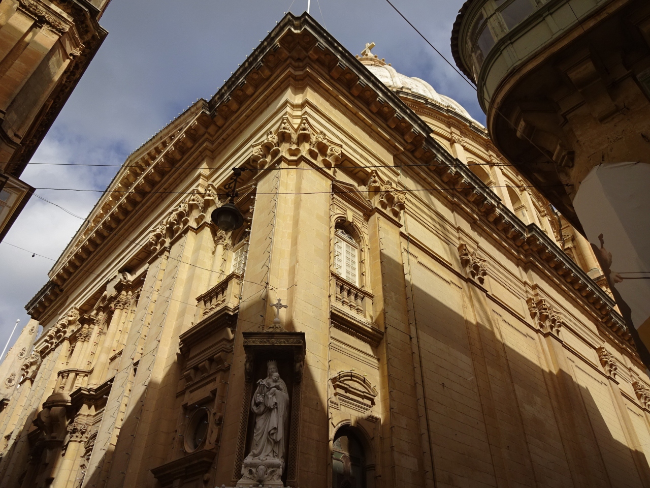 マルタの写真を見たことがあるなら、この教会を見たことのない人はいないでしょう。スリーマから見た海の向こうのヴァレッタの景色で、一番目立っている象徴的なドームはこの教会のものです。遠くから見るととても目立つ教会ですが、周辺に建物が密集しているので、近くからはなかなか見つけることが出来ませんでした。見上げてもほとんどドームが見えません。