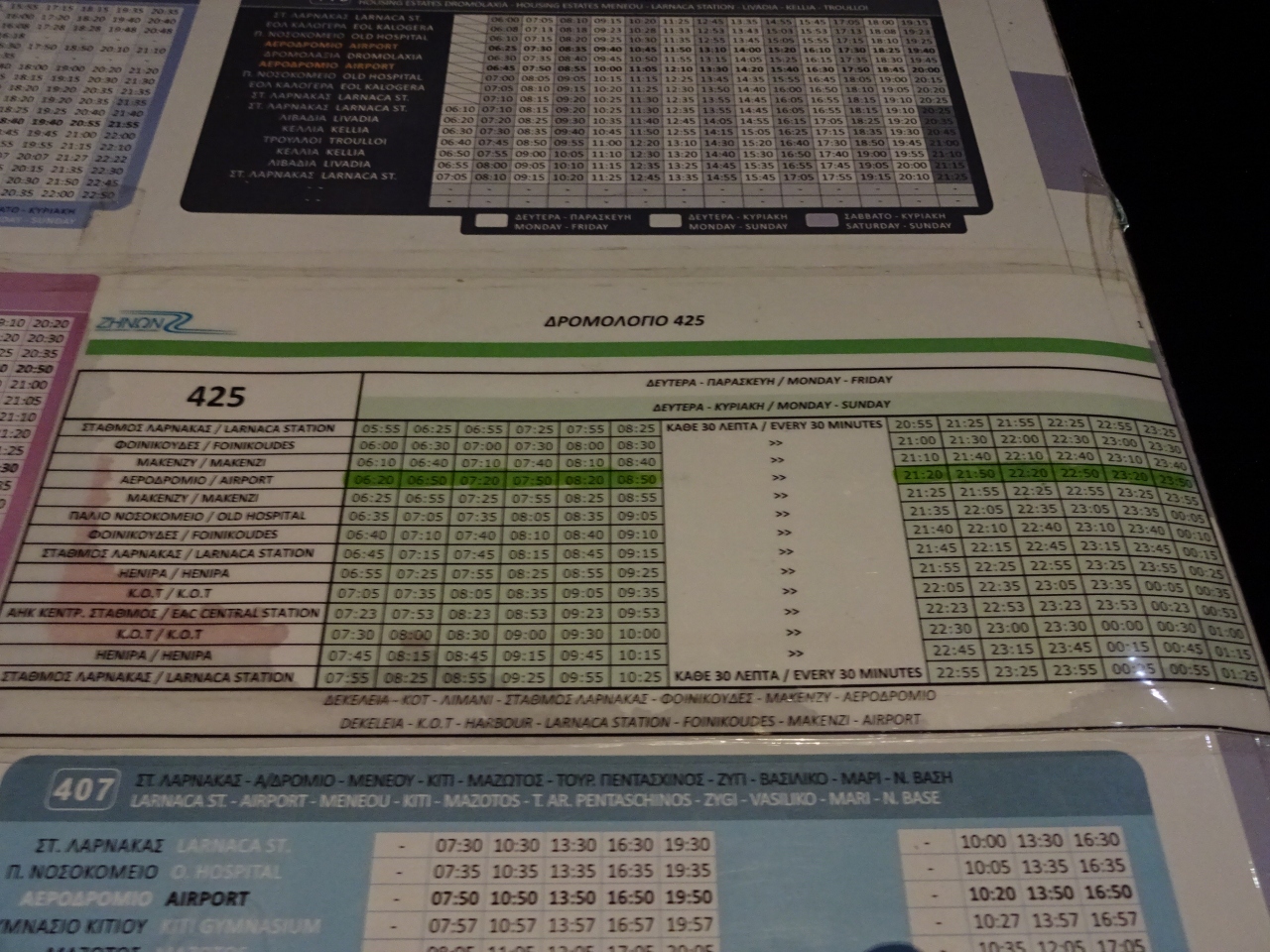 空港からラルナカ市内への移動は市バスが便利です。ラルナカ中心部のアシノン大通り行きのバスが、土日関係なしに6時台から23時台まで30分に1本出ています。各20分と50分発。運賃は1.50EURです。