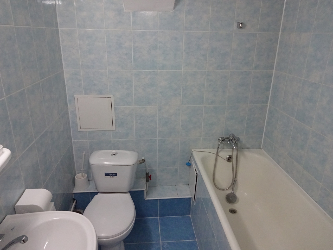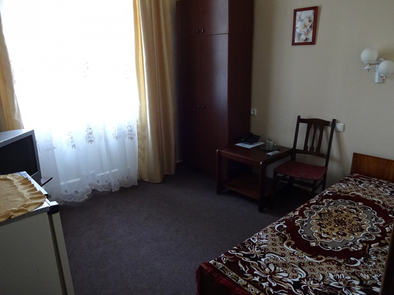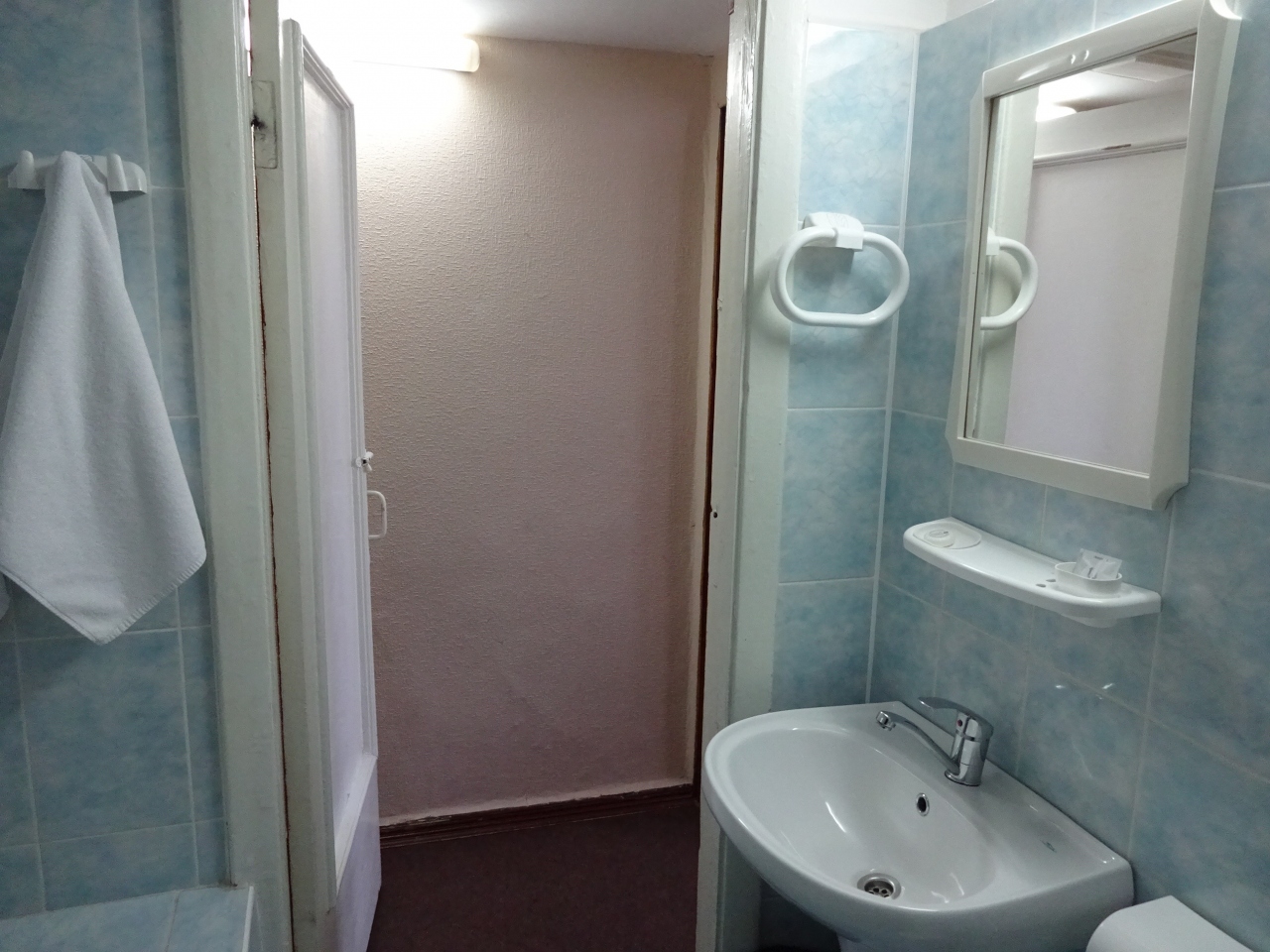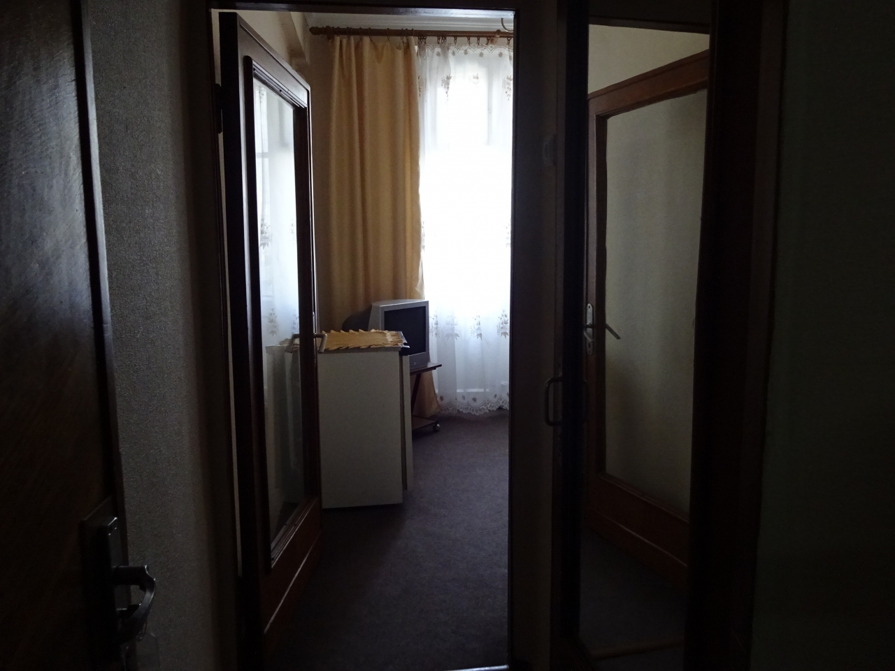 部屋はわりと老朽化していますが、冷蔵庫やテレビ、バスルームには浴槽もあって快適でした。解放広場に面した部屋でしたが、窓枠がペンキで塗りこめられていてベランダには出られませんでした。もっと高い位置にある窓は開きます。