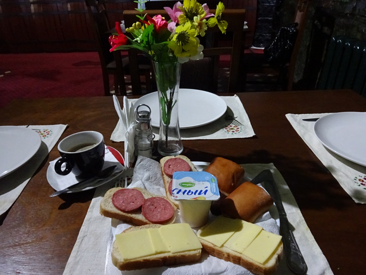 大きなホテルです。朝食は8時からですが、その前にチェックアウトしなければならない旨を説明したら7時半から食べられるようにしてくれました。チェックイン時に朝食メニューを見せられ、3種類から選ばせてくれました。朝食会場はホテル内の洞窟風レストラン。レストランのスタッフに何やらレセプションで貰えるというカードを求められましたが、貰ってない…。結局スタッフが確認しに行ってくれたのか、カード無しで朝食を出してくれました。その後チェックアウトの為にレセプションに行ったらそのカードを渡してくれたので、もう朝食を済ませたことを伝えるのに苦労しました。朝食前にレセプションに寄るのが正解だったようです。