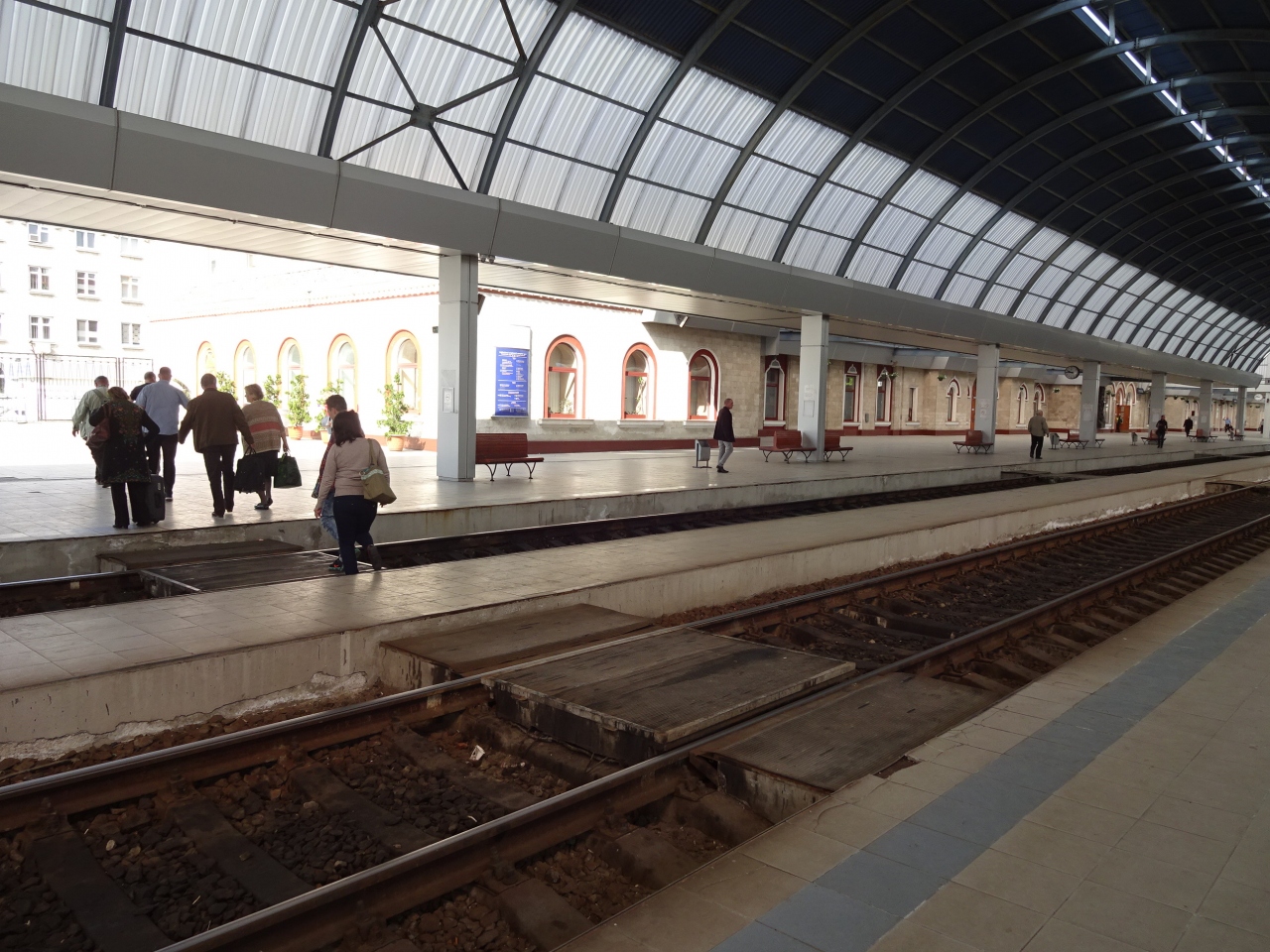 新しそうで大きく立派な駅ですが、列車の発着はかなり少ないようで、駅構内のホーム間を移動する通路は線路の上(高架という意味ではなく)にありました。のんびりした雰囲気の駅です。