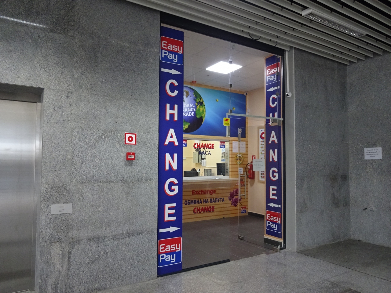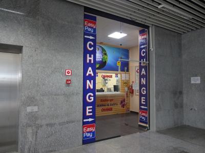 外観も中の構造もまるで空港のよう。両替所は入って左隅の方にありました。