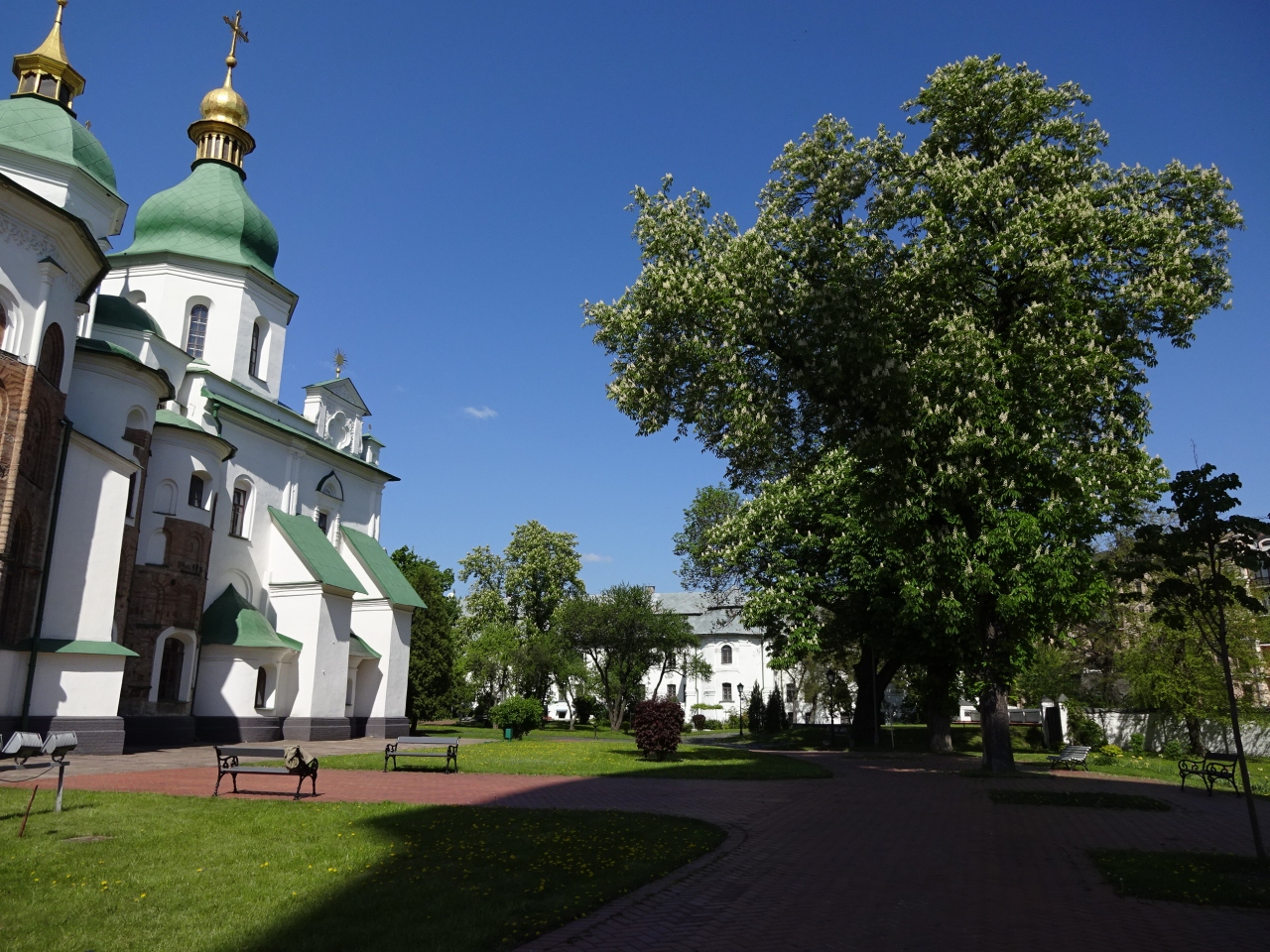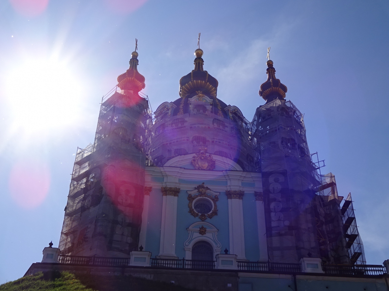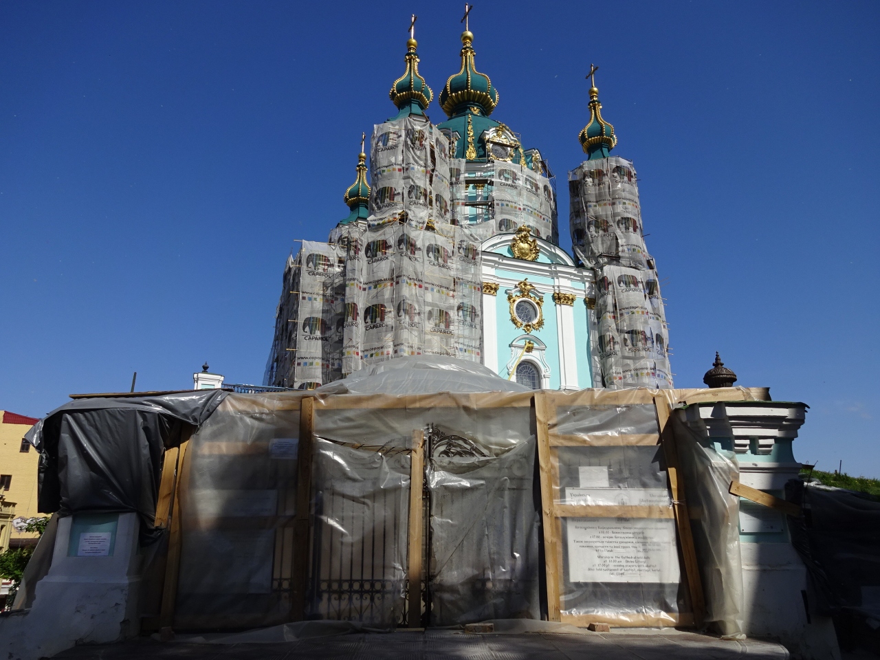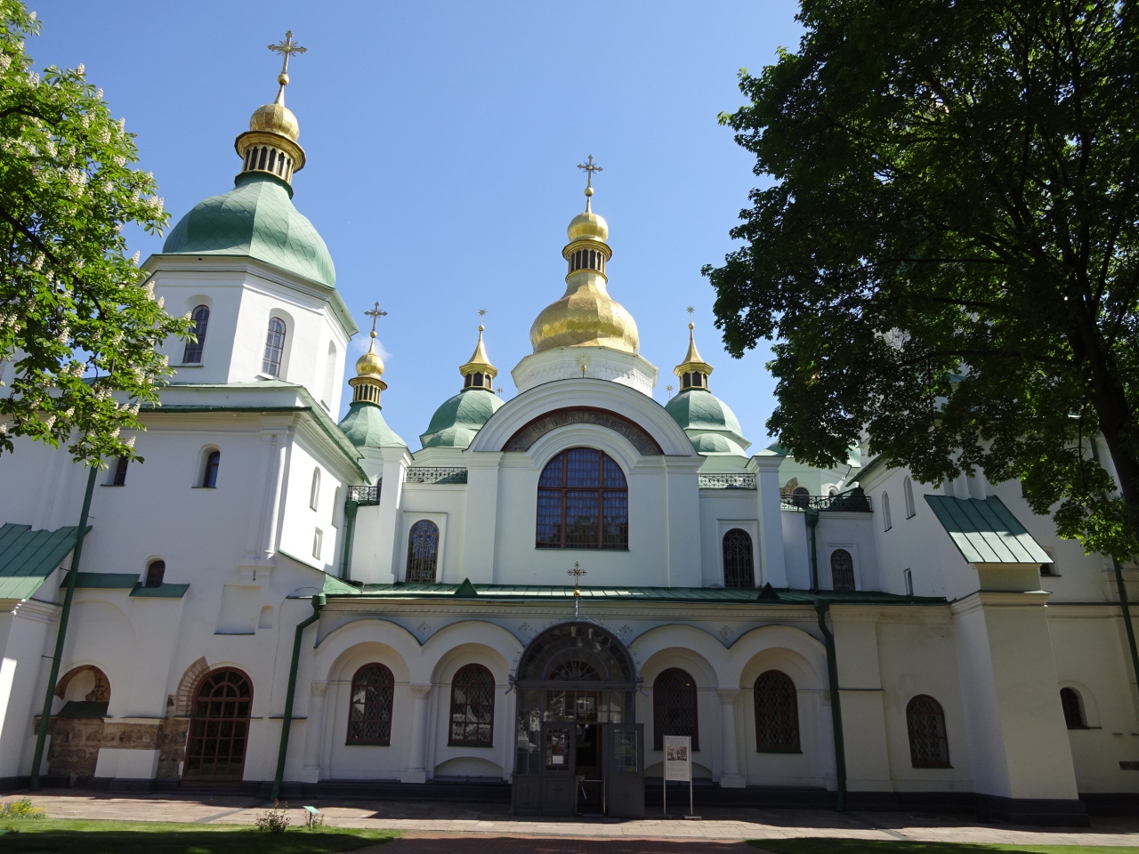 鐘楼とソフィア大聖堂は全くデザインが異なります。大聖堂の外観は17世紀後半にウクライナ・バロック様式で再建されたものだそう。鐘楼は外から見ると、結構傾いているように見えました。- 旅行時期