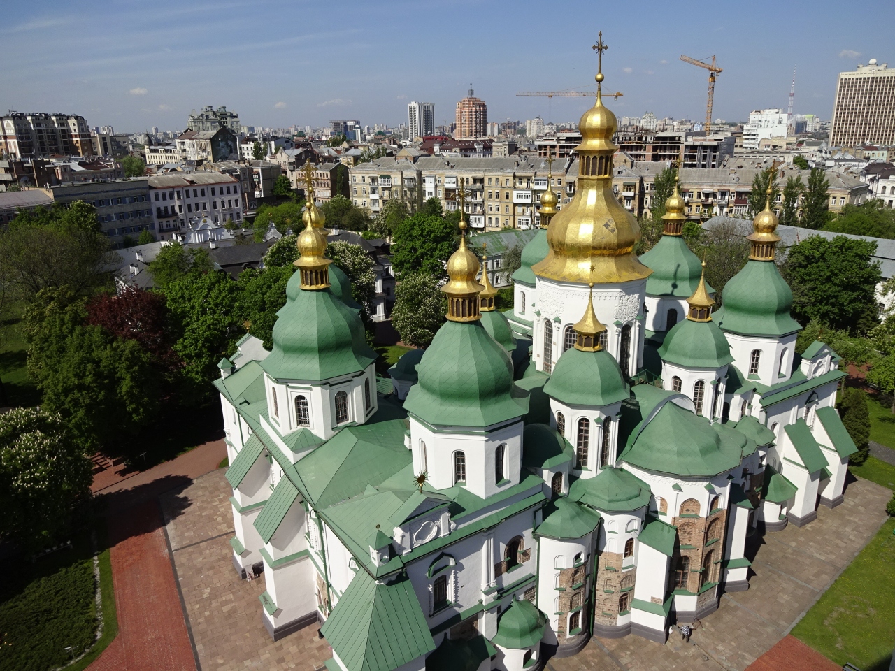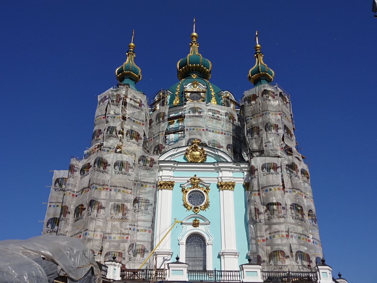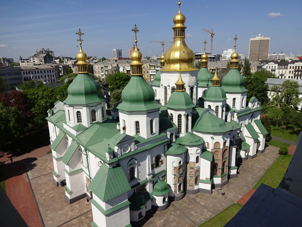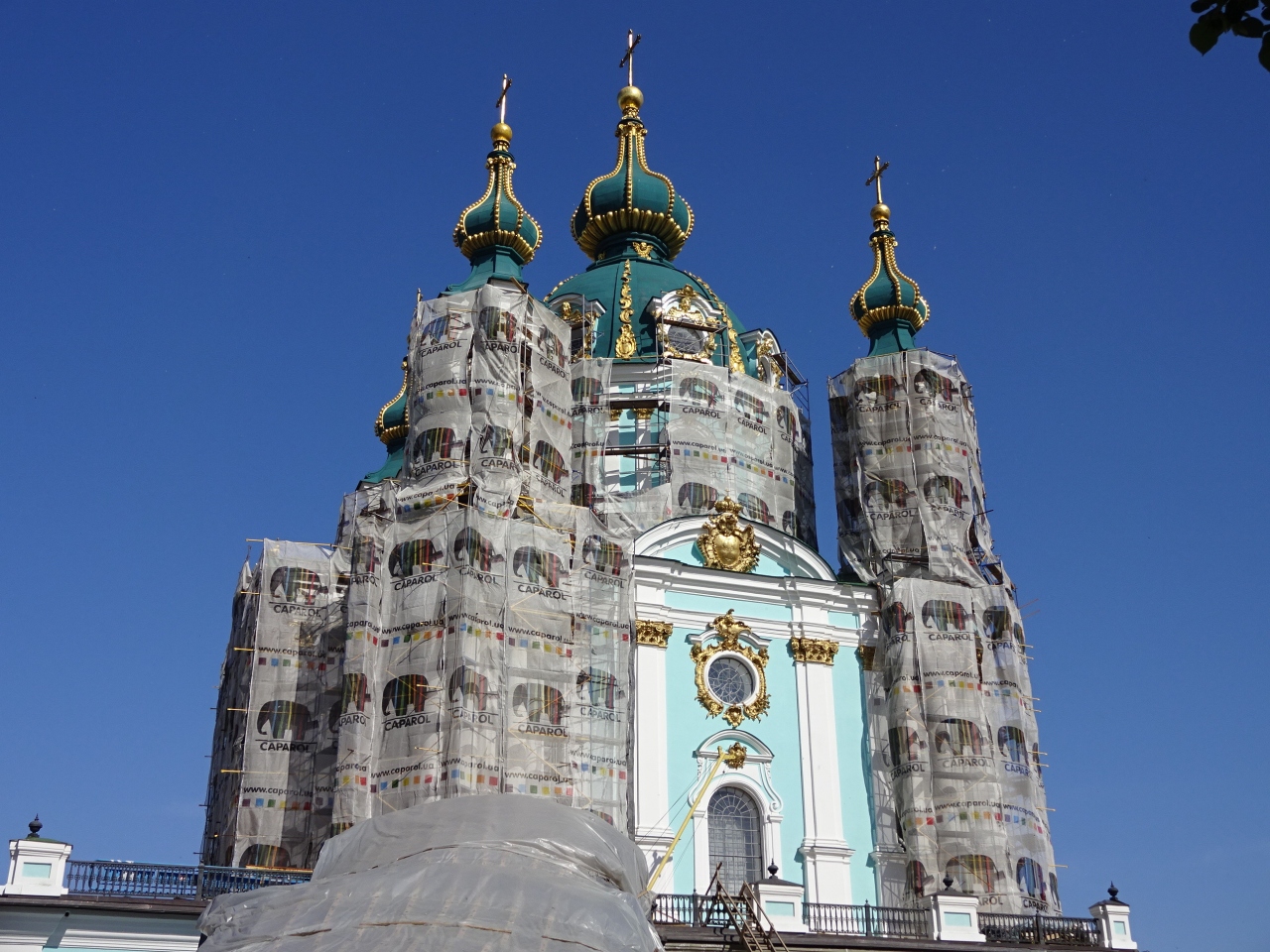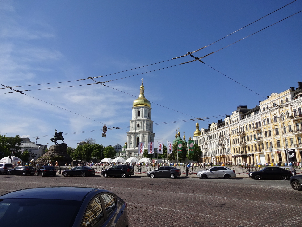 鐘楼とソフィア大聖堂は全くデザインが異なります。大聖堂の外観は17世紀後半にウクライナ・バロック様式で再建されたものだそう。鐘楼は外から見ると、結構傾いているように見えました。- 旅行時期