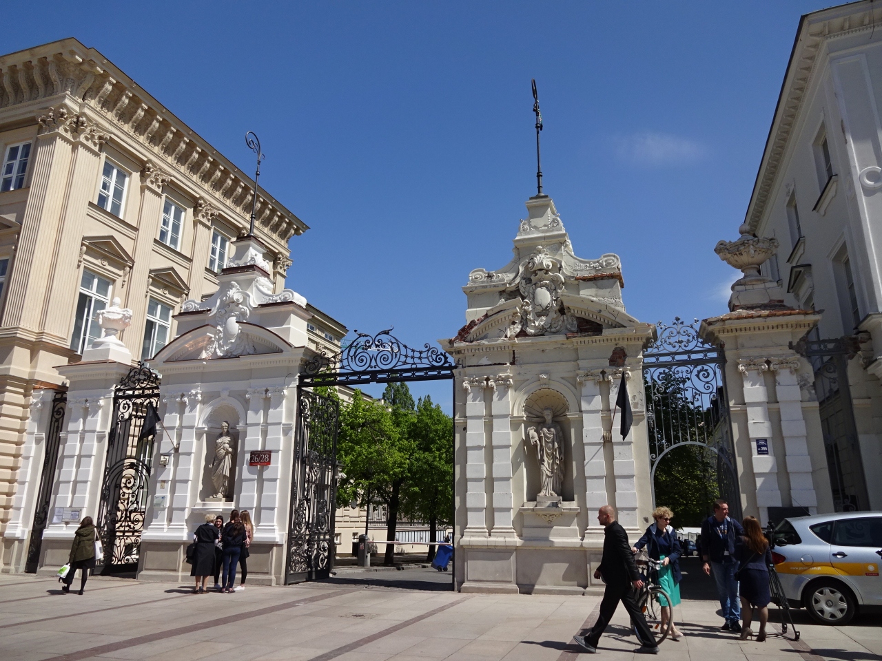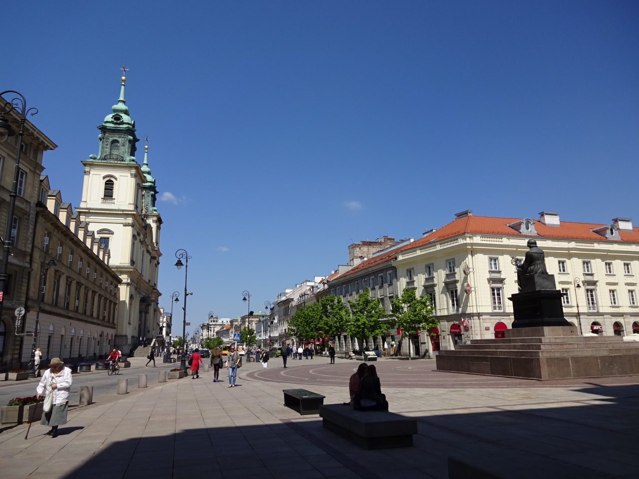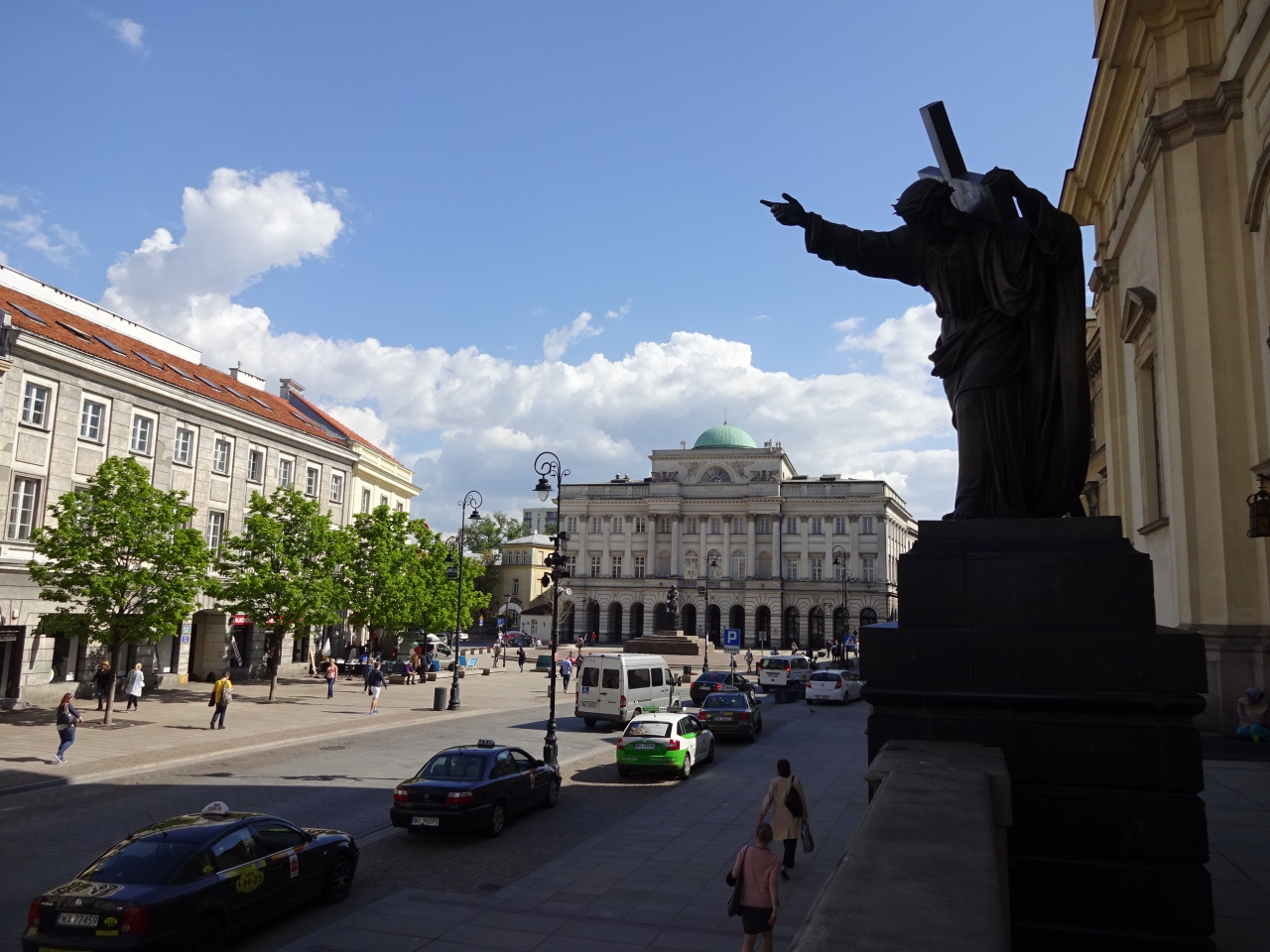 コペルニクス像は、新世界通りとクラクフ郊外通りとの間にある広場に建っています。コペルニクスの足元には太陽系が描かれています。後ろの建物はスタシッツ宮殿、現ポーランド科学アカデミー。