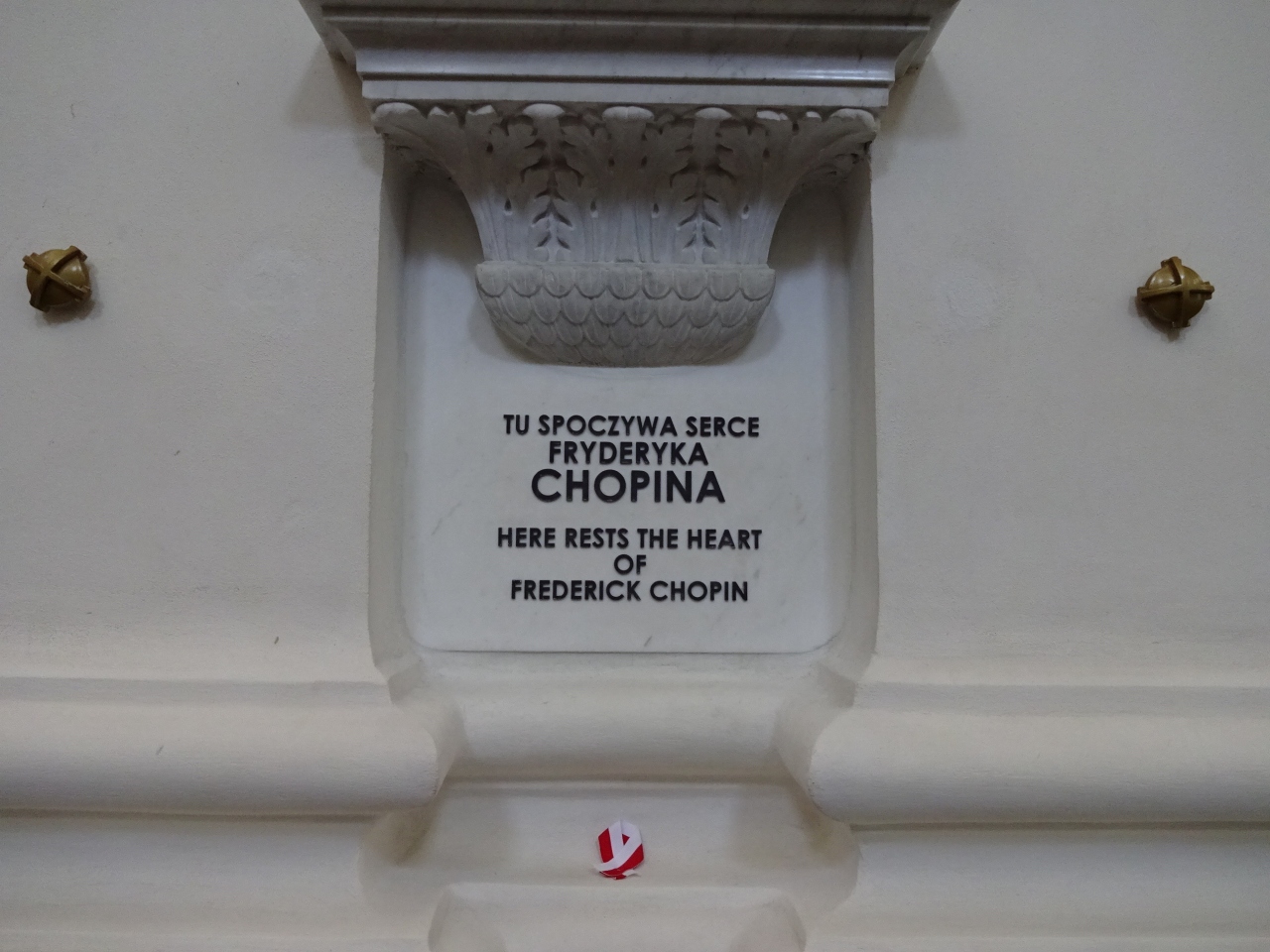 心臓が納められているのは入って左手の柱です。ショパンが1830年にウィーンへ演奏旅行に出掛けた折にワルシャワで11月蜂起(ロシア帝国の支配に対する反乱)が起こり、結果的にショパンは生涯ポーランドに戻ることが出来なくなってしまいました。ショパンは1849年、39歳で亡くなる前に姉のルドヴィカを住んでいたパリに呼び寄せ、「心臓をポーランドに持ち帰って欲しい」と頼みました。