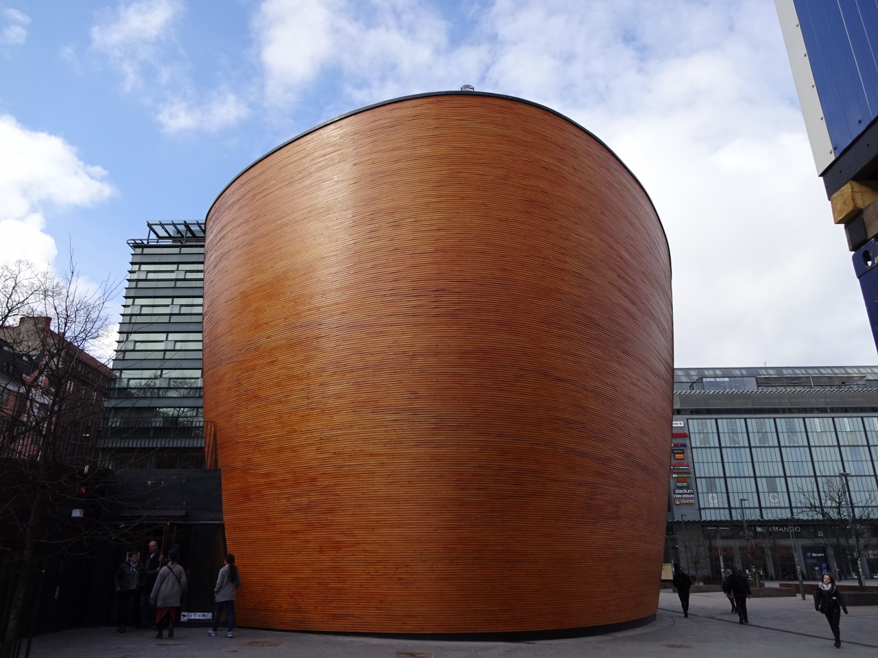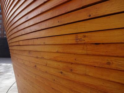 事前情報無しにはとても教会とは思えない、ユニークな外観の教会です。外壁に近付いてよく見てみたら、曲げわっぱのようにカーブを描いているんだけど階段のようにギザギザしており、木の手触りは滑らかではなくザラザラしていました。