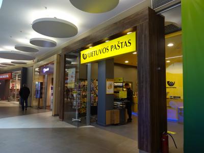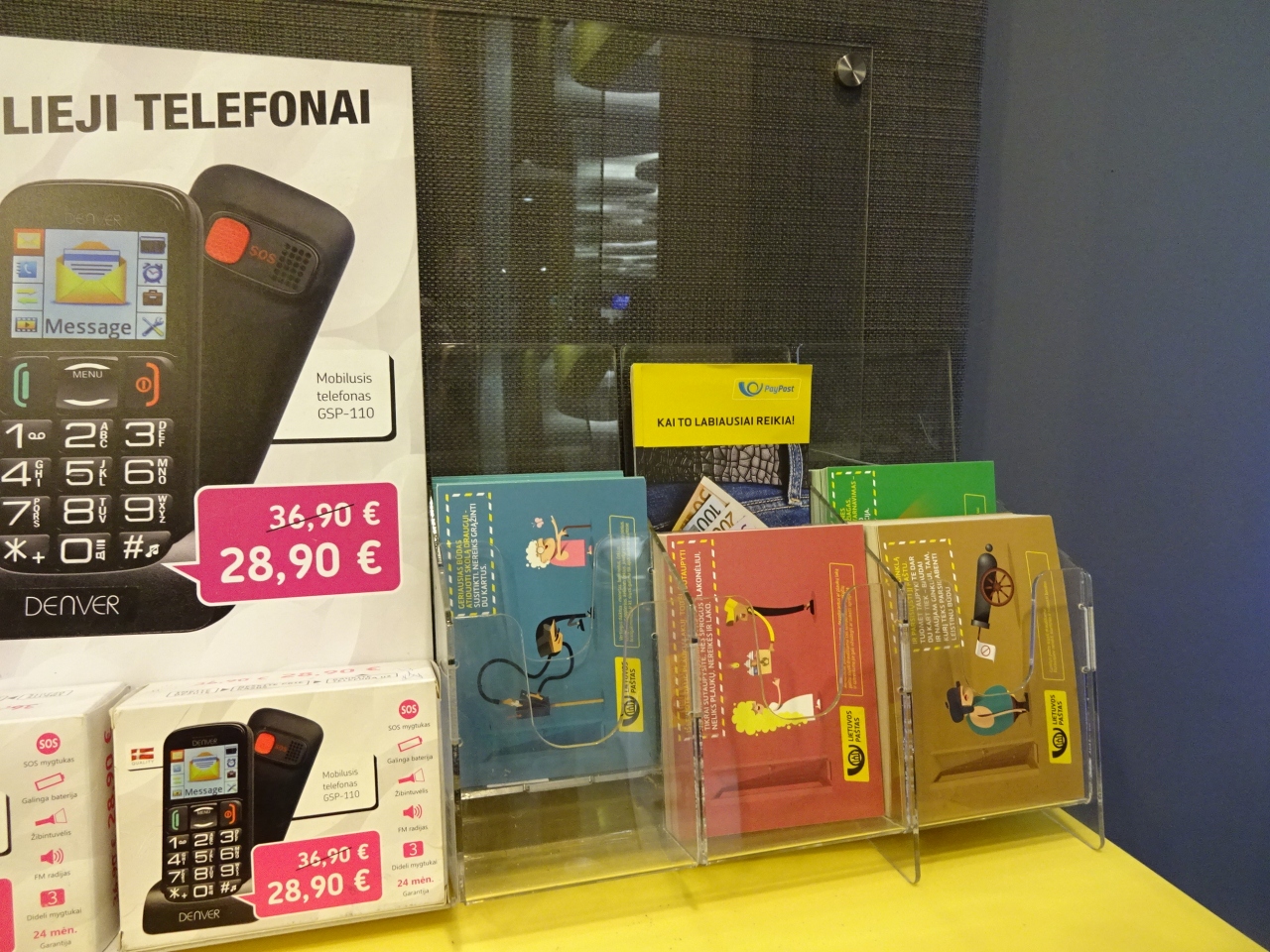 シャウレイのバスターミナル併設のショッピングモール1階に郵便局があります。窓口のお姉さんに「日本へポストカードを送りたいのですが」といつもの定型文を言うと、「いくらの切手ですか?」と逆に尋ねられてしまいました。えっ、そんなこと聞かれたの初めて。切手代は結構改定されるので確認してから購入したかったんですが、歩き方に書いてある0.84EURの切手で送ったら無事届きました。