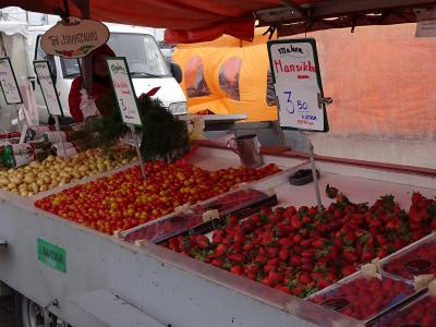 他の市場とイメージがごっちゃになって、マーケット広場は屋内に入っているものだと思い込んでいました。屋外だったんですね!その前の夜にもこの広場を通っていましたが、夜は端にハンバーガーの屋台があるのみで、テントも片付けられガランとしていました。