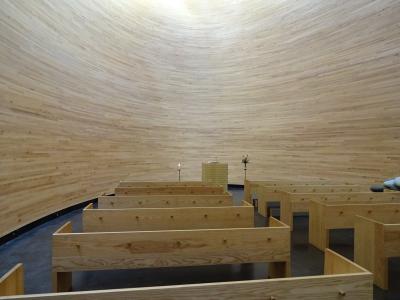 入口は端の黒い部分。小部屋の中にスタッフがいて、教会内に誘導してくれます。教会内は木材オンリーで非常にシンプル。屋根に円形に隙間のような窓があり、自然光でとても明るい。不思議な教会でした。- 旅行時期