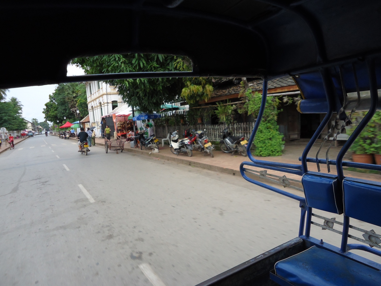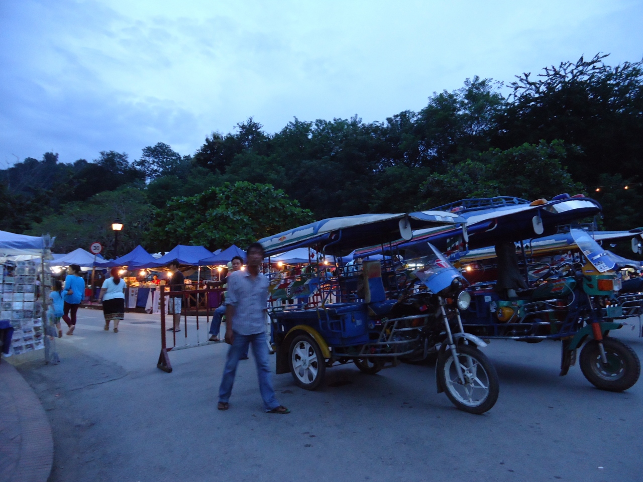 郵便局前の交差点の辺りにはトゥクトゥクの運転手がたむろしており、写真を見せながら「クァンシーの滝に行かないか」「洞窟に行かないか」と勧誘してきます。よく見ると大抵のトゥクトゥクの屋根の上には「ツアー 滝 洞窟」等と英語で書かれていました。