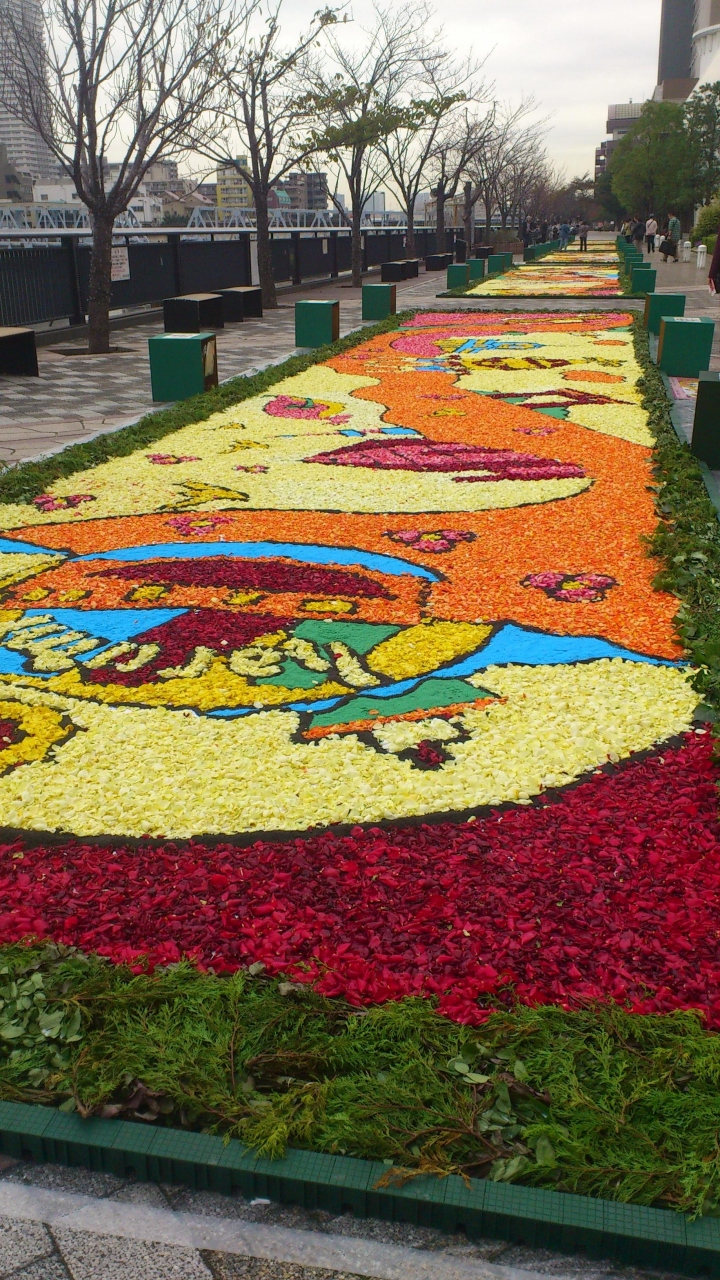 Toriton」に足を運んだ。記事は夜のライトアップの模様を写していたが、夜からは天気が崩れそうだったので急いで午前中からの見学にした。地域の方々が協力して一つ一つが丁寧に作られ見ごたえがあった。季節によって咲く花の色が違うので仕方ないが青や緑の部分も植物を使用されていたほうがより自然であったろう。全体的に規模は小さくあっという間に見学終了となりかえりは近くの築地でお買い物して帰ったのであった。- 旅行時期