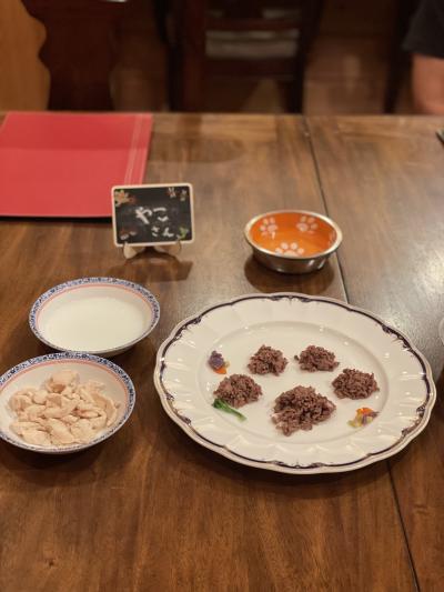 やこちゃんの夕食は鹿肉のミートローフとササミとヤギミルクのセット。お皿...