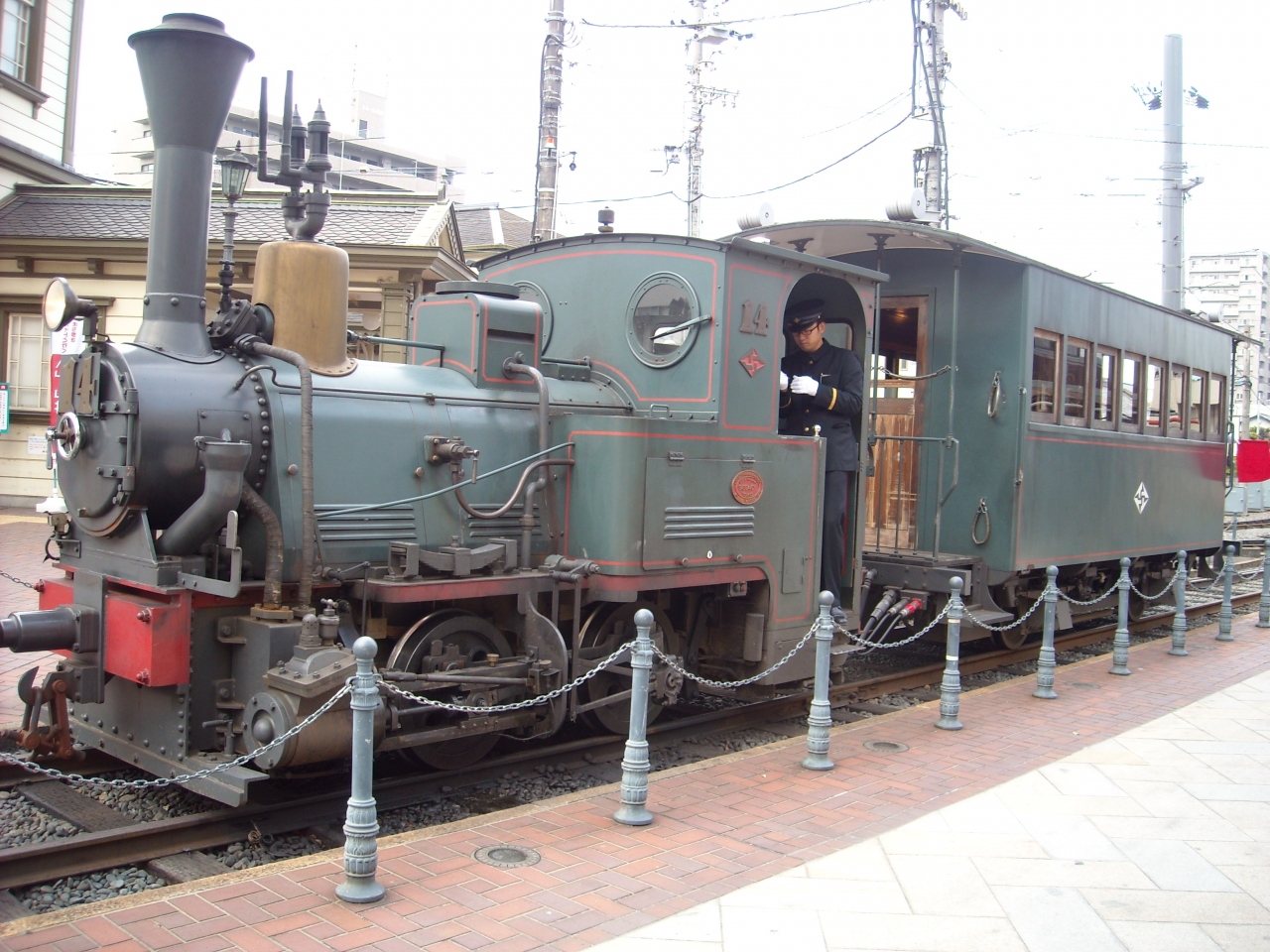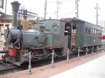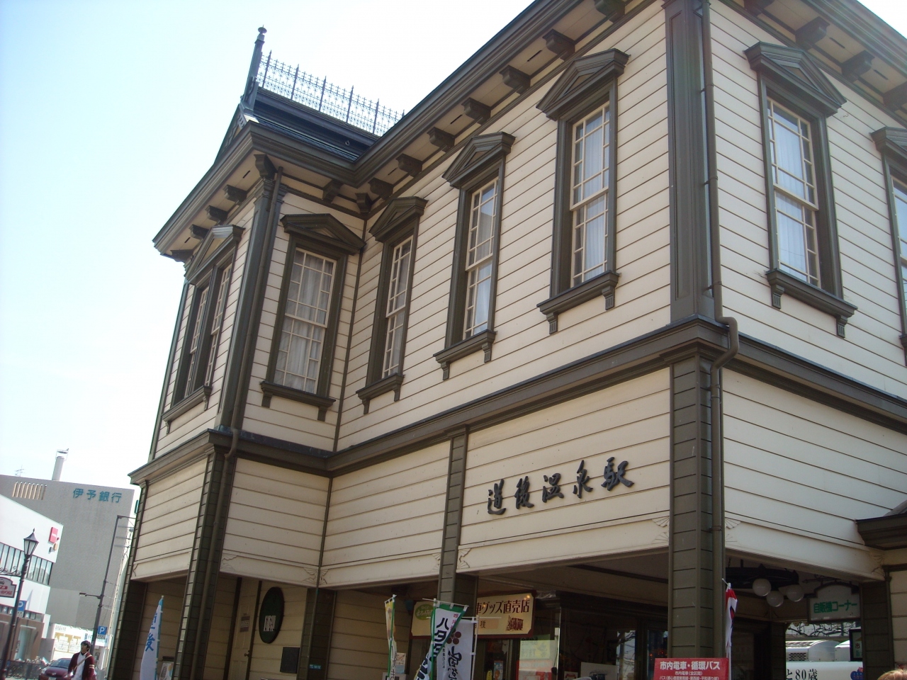 松山ではレトロな機関車の形をした路面電車「坊っちゃん列車」が走っています。夏目漱石が小説の中で「マッチ箱のような汽車」と表現した列車を復刻しただけあって、可愛らしい列車です。運行していない時間なら道後温泉駅のすぐ横に坊っちゃん列車が停車しているかもしれません。道後温泉駅内のショップは現在はスターバックスに代わってしまったようです。