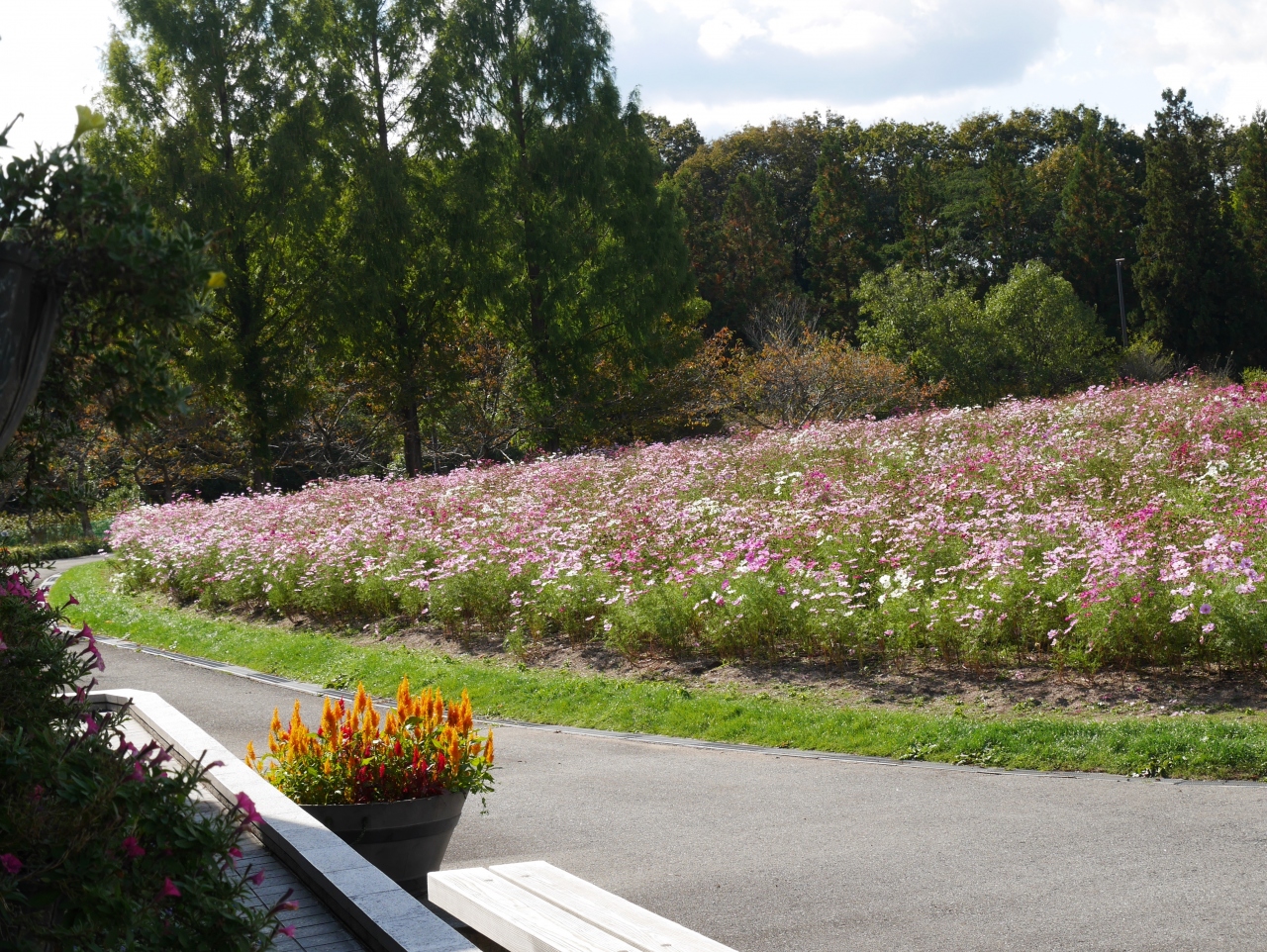 コスモスのイベントが終了して冬のイルミネーションのための電飾準備などしている時だったので、花の広場への入場はできませんでした。オフシーズンなので咲いている花の種類は少なかったですが、ケイトウなどは綺麗に咲いていました。