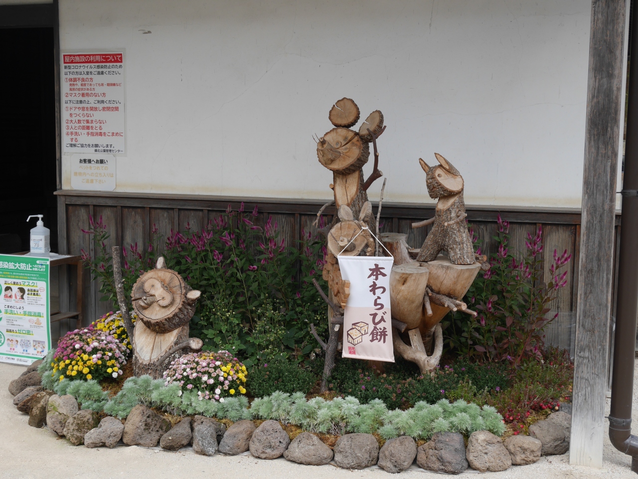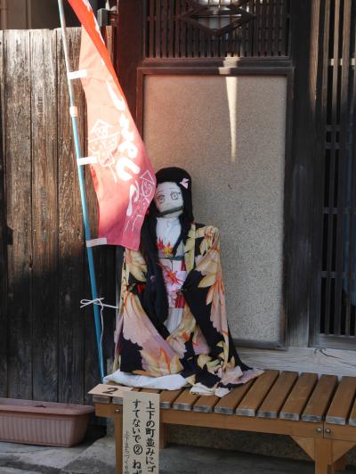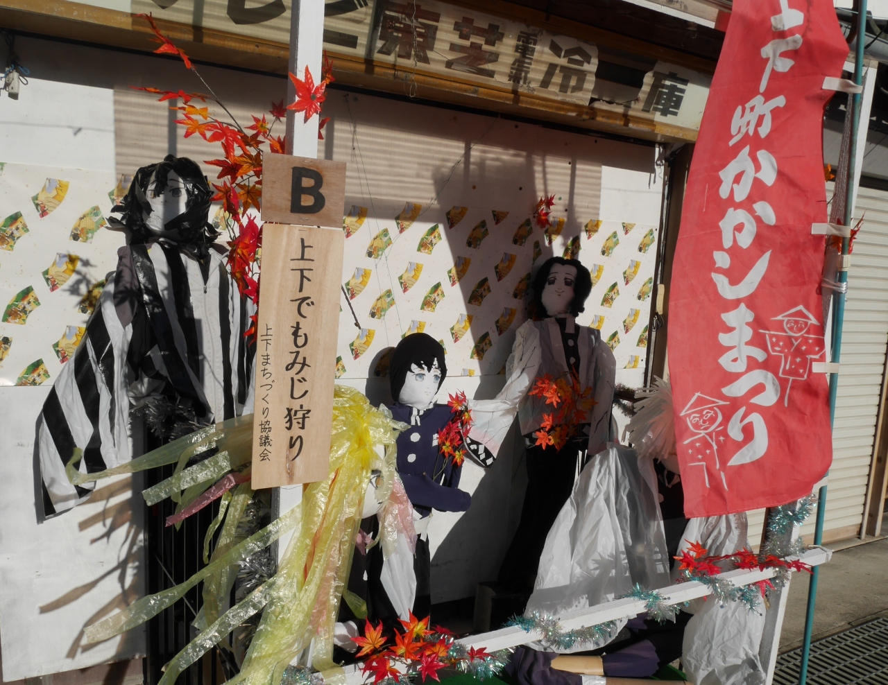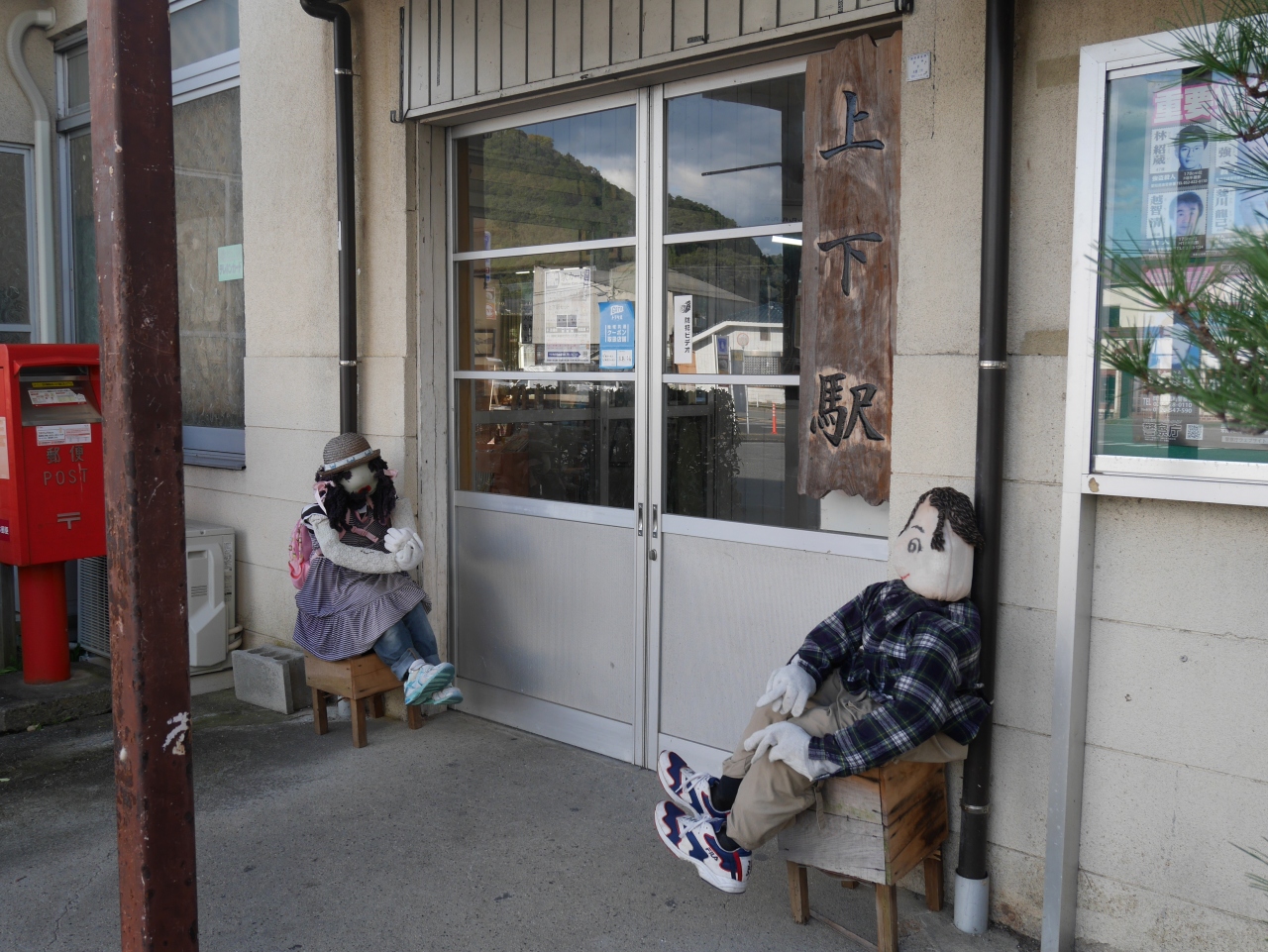 10月中旬は上下かかしまつり開催期間らしく、上下駅前だけでなく観光案内所の前などにも、今年の話題などを取り入れた作品が設置されていました。