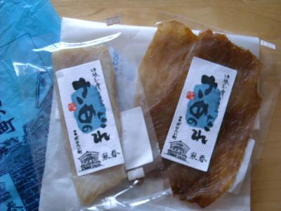 さめのたれを売っていますかと他の店で聞くと、それはおはらい町の魚春さんにありますよという話。伊勢名物のさめのたれとは伊勢神宮の神様にお供えされたりもするという鮫の干物です。しおたれとみりんたれと両方買って1800円でした。干物だけど要冷蔵です。保冷剤をつけてもらい自宅まで持って帰り焼いて食べました。神饌にもなる物なので神聖な気持ちでありがたくいただきました。塩味がしょっぱいけれど旨みがあって美味しいです。