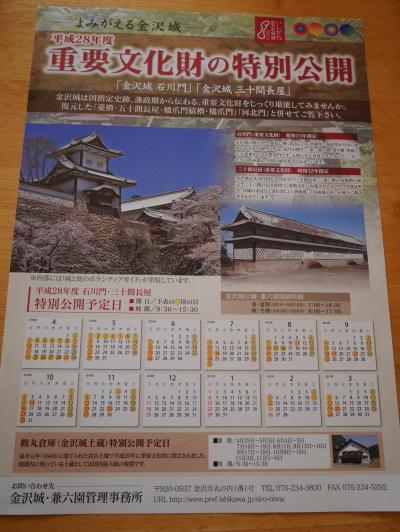石川門と三十間長屋の公開日については金沢城の公式ホームページには公表されていません。冬季以外はほぼ毎週土曜日・日曜日と祝日は公開されているようです。ただし公開時間がほかの有料櫓よりも短く9:30から15:30までです。その代わり内部には城と庭のボランティアガイドが常駐しています。