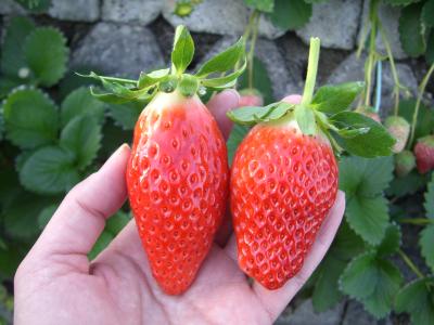 石垣の間にいちごが栽培されているのでハウス内も清潔です。立派な花や葉を見るとこれ「美味そう」と...