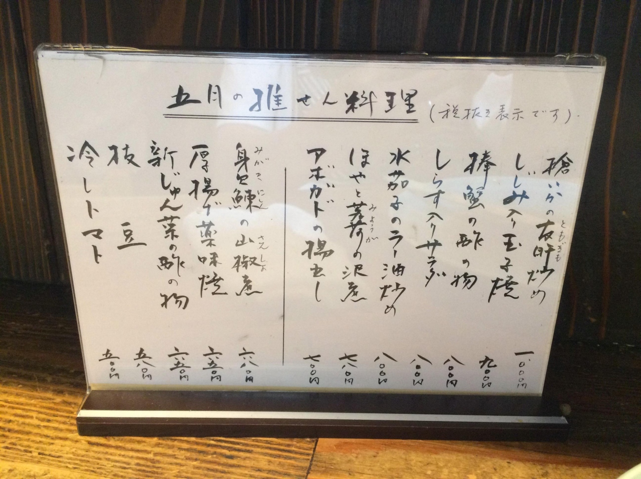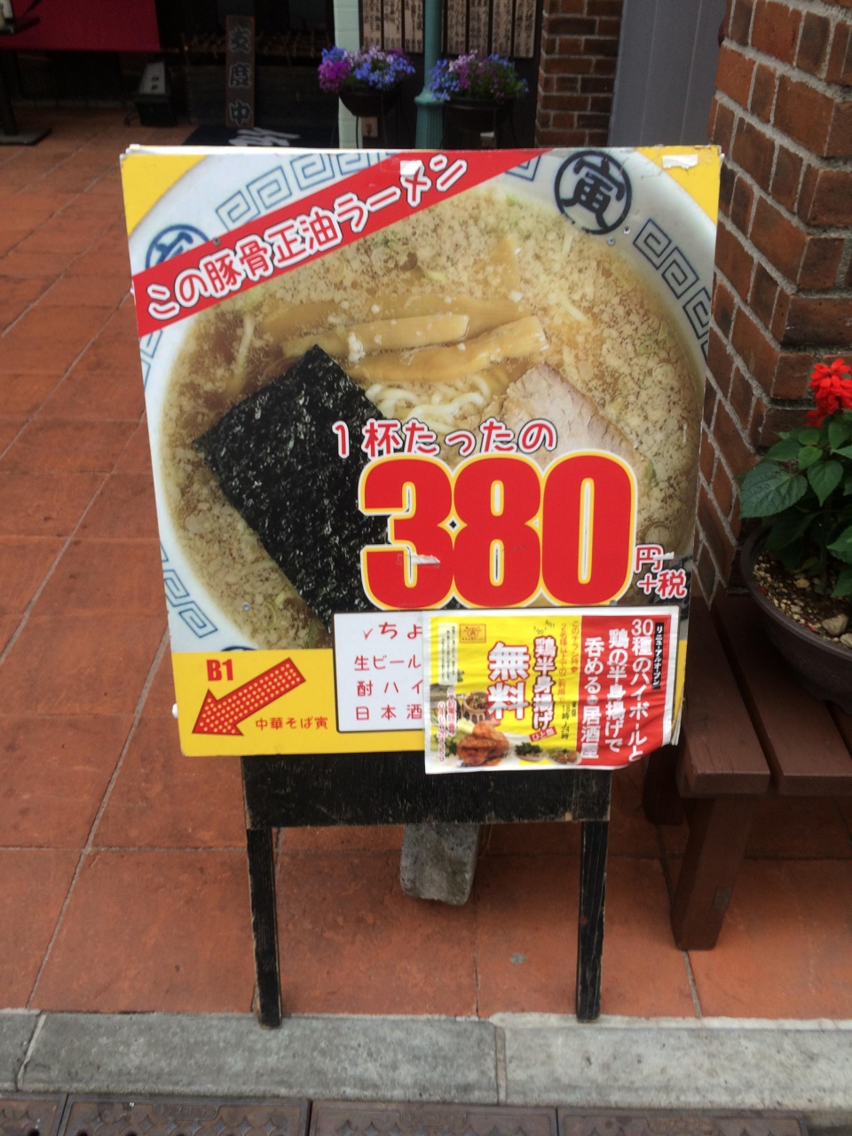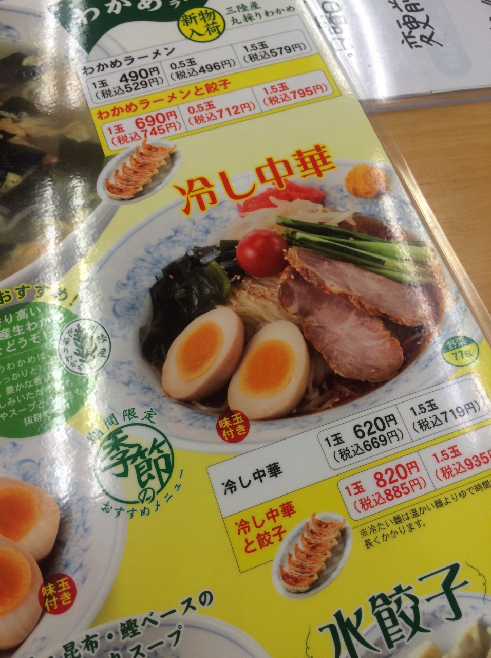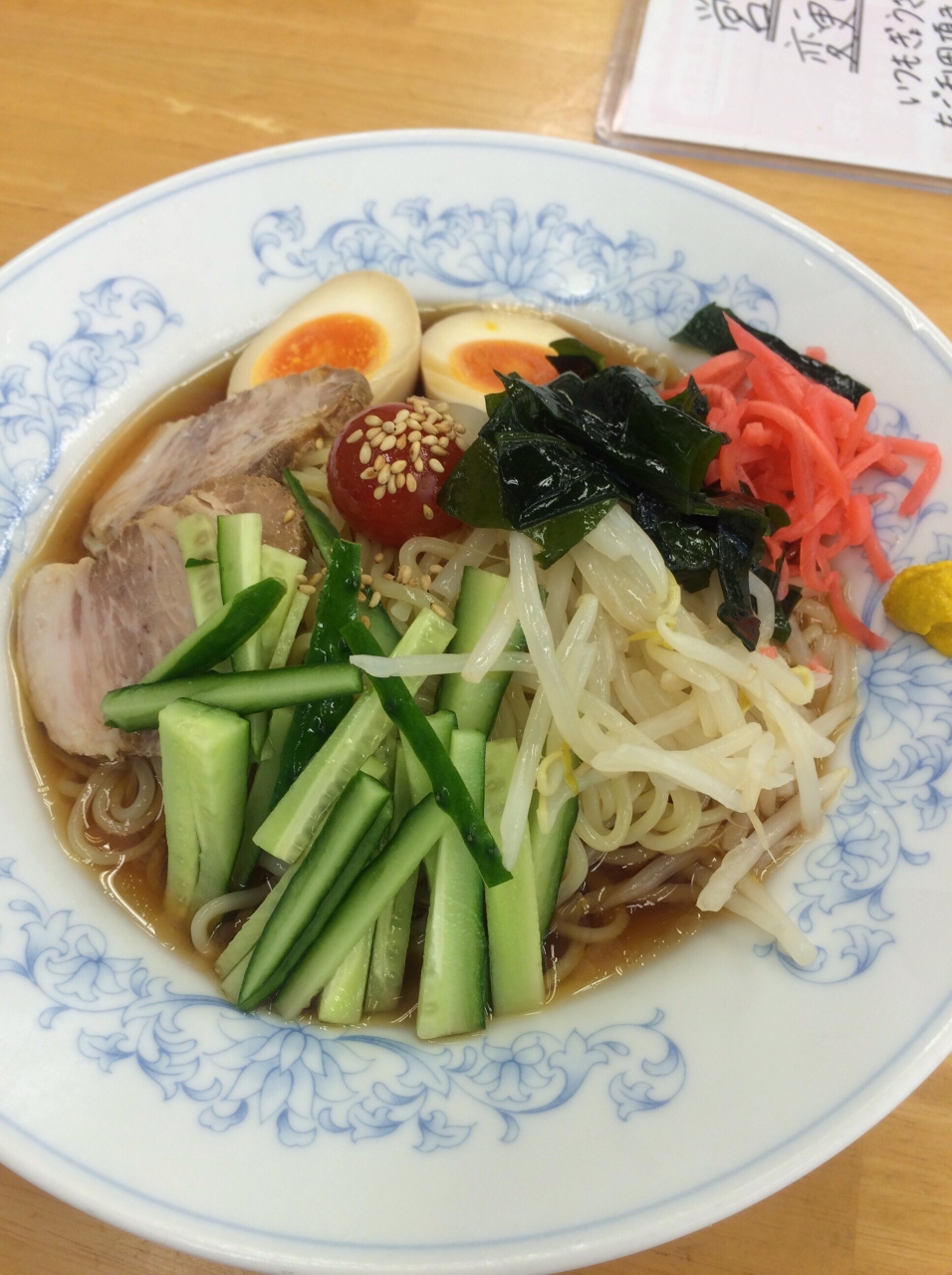 外の看板、煮卵も2つ、チャーシュー2枚入った冷やし中華が680円と、リーズナブルなプライスに惹かれ