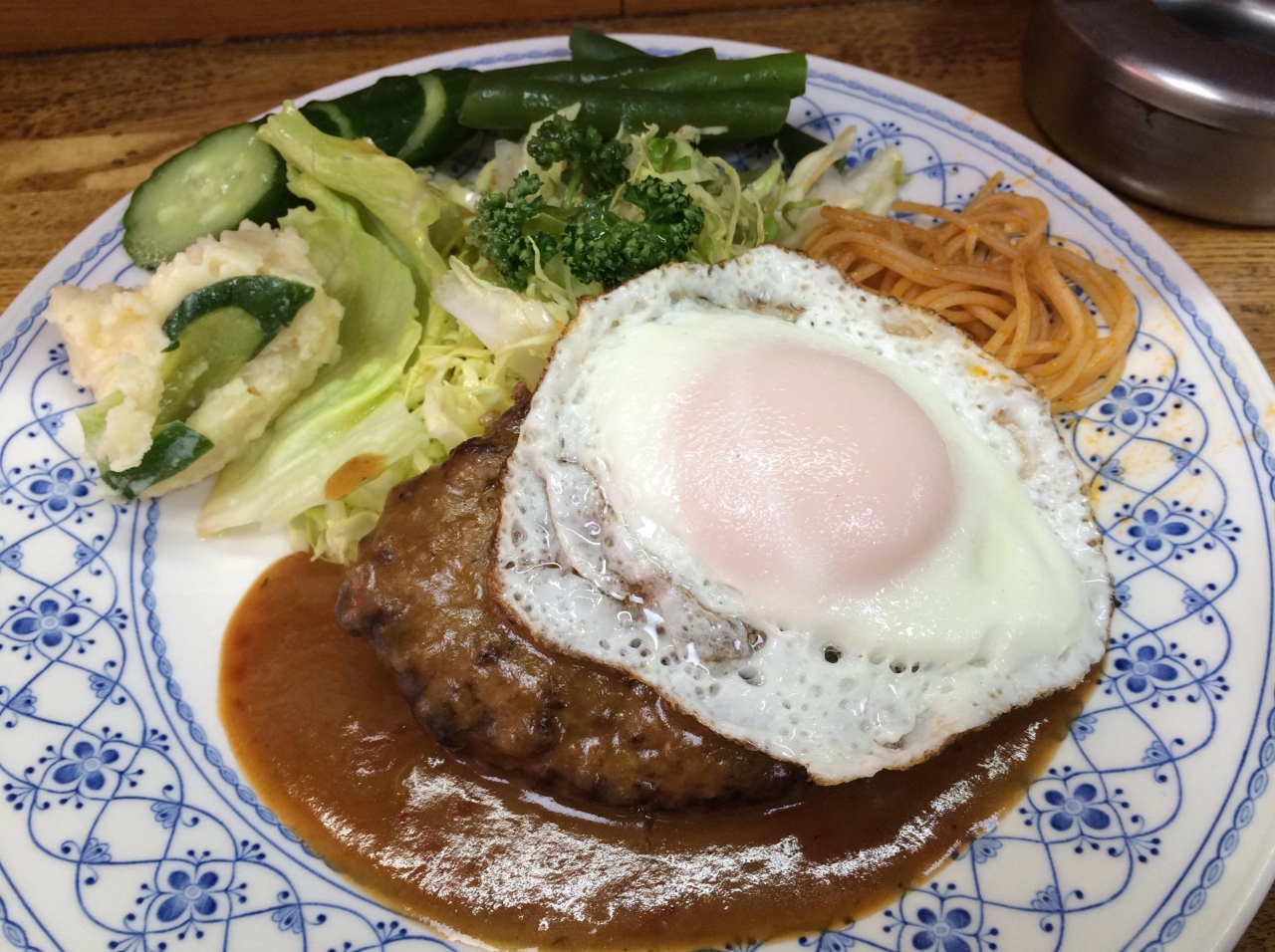 ハンバーグに目玉焼き、付け野菜はキャベツ、太インゲンと胡瓜、ドレッシングは自家製