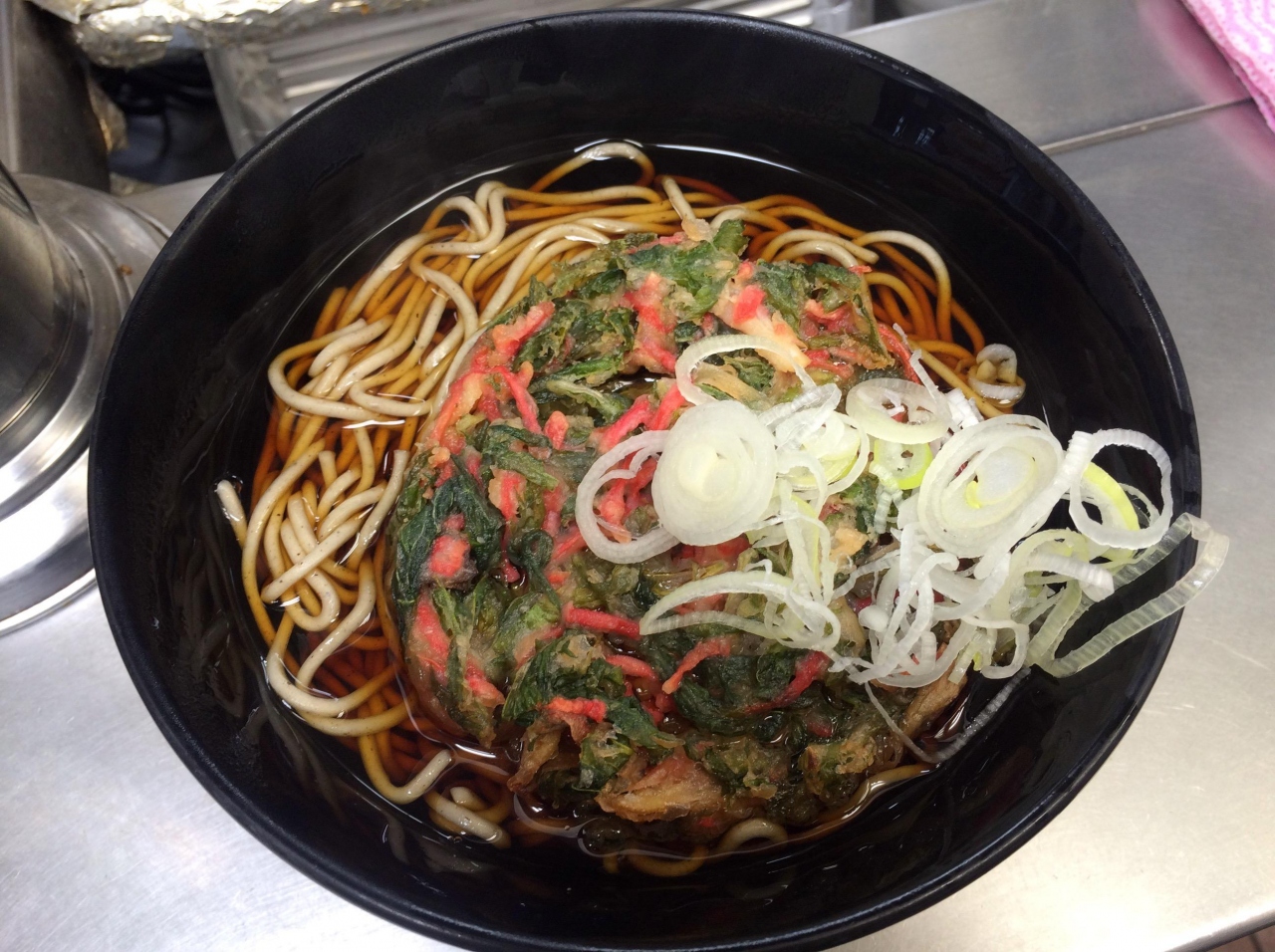 わさび菜紅生姜天そば400円を