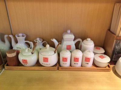 客用カウンター、テーブルも調味料や箸の束、酒瓶で散らかし放題