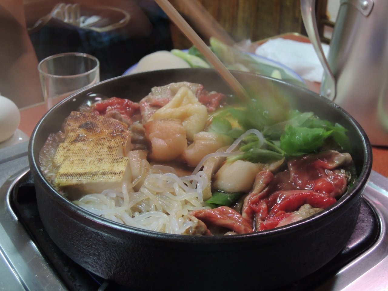 四条通から寺町通入りすぐの左にある、なんとも昭和チックなすき焼の名店。玄関らしてちょつと敷居が高いかな?と入口。玄関番の方が居ます。赤のカーペット敷きの階段を上がり2F座敷に。4人で一杯のテーブルに案内されます。メニューは2品ののみ。(昼はお得なランチあり)昭和に戻ったような雰囲気の中で、京都で大衆すき焼を楽しむ、という雰囲気のお店。