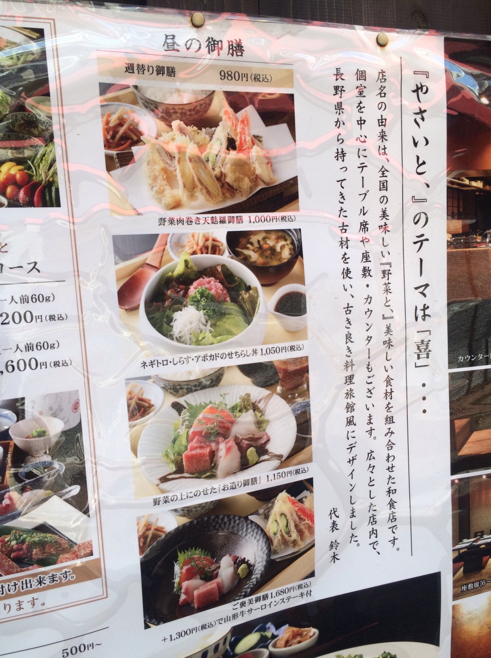 中野坂上交差点から、松屋脇の路地を入って左すぐの近くにある創作和食のやさいとでランチ