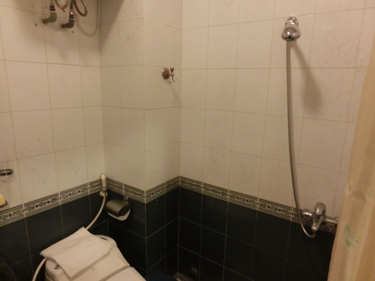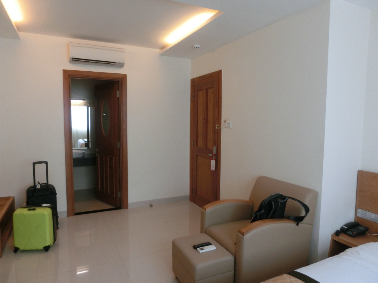 ホテルは、エアコン付きで快適。近くに24時間営業のスーパーというかコンビニみたいなところもあり、便利でした。ただ、エアコンから水漏れがして、フロントにいうとすぐに修理させるみたいなことをいったのですが、修理どころか何の対策も講じないので、ゴミ箱で水漏れを対処。翌日清掃係にバケツをもらい応急処置。結局修理はされませんでした。