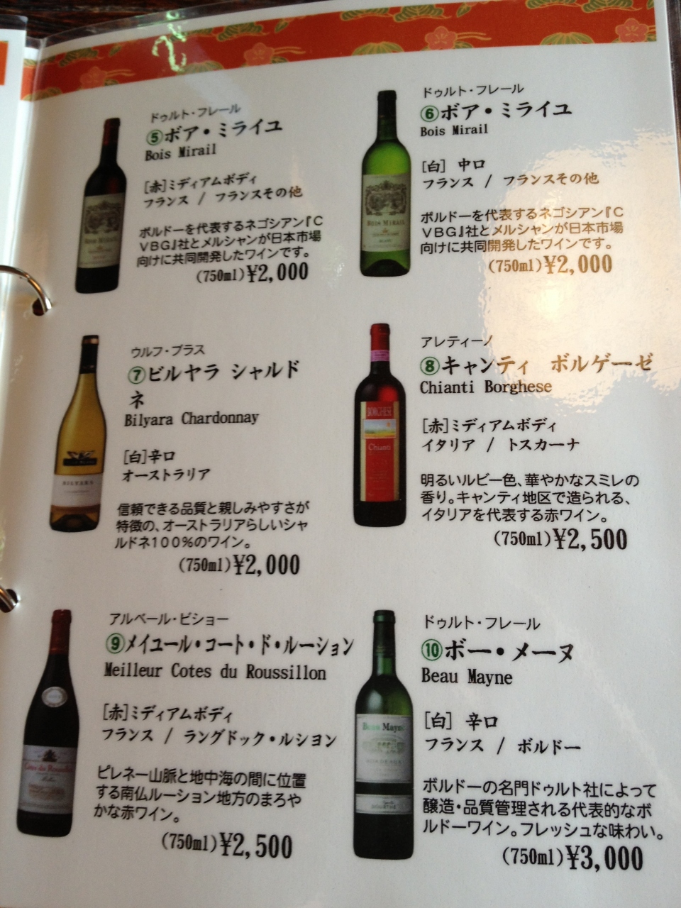また、夕食時は赤ワインをオーダーしましたが、フルボトルで3,000円からとリーズナブル。