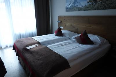 ツェルマット駅に近くてマッターホルンが見えると言う事で予約しました。マッターホルンは隣のホテルの屋根越しに見る事が出来ました。部屋は狭くて簡素ですが、水回り、バスルームは綺麗でジャグジー付きバスで良かったです。ホテルはこじんまりとしたアットホームな雰囲気です。湯沸しポットなど頼めば貸し出してくれます(常時レセプションに人がいないので注意が必要です)。朝食は必要最低限と言う感じ(まぁこのクラスのホテルとして普通と思われます)ですが、朝食時の女性スタッフがテキパキしていて良かったです。総じて良くも悪くもない印象でしたが、チェックアウト時スタッフの対応で全てが悪くなってしまいました。予約サイトで2泊予約して支払い済みなのに1泊分の支払いを請求されました。拙い英語で説明しても通じず時間が掛かり予定の電車に乗り遅れました(この時中国人扱いされて非常に気分が悪かった)。英文の予約確認書の持参をお勧めします。