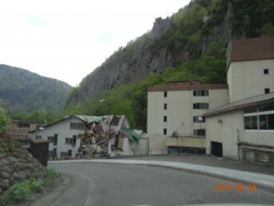 旭岳の後、天人峡に立ち寄ってみました。夕方近くと言う事もあるのか?怖いくらいに寂しく感じました。道路はまずまず新しいのですが、廃虚となった宿?などがそのまま残っていたりして、観光地とは言い難い佇まいでした。