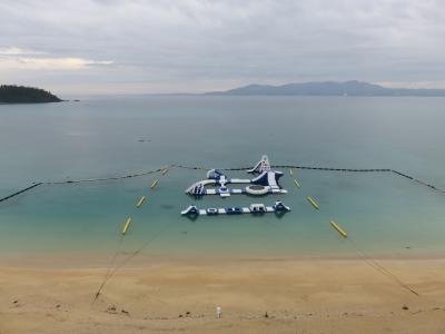 目の前の海には、アクアパーク(有料)が設置されていました(良いのか?悪いのか?家族連れには良いのかな?)。またビーチにはおしゃれなビーチパラソル・ベッドが有りましたが、これは近くの丘の上にあるリッツカールトンホテル用の物でした。